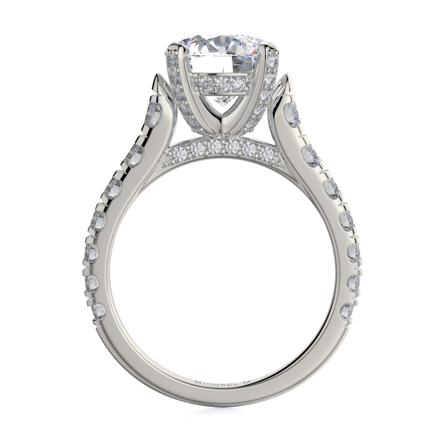 Immaculate Michael M engagement ring with stunning round center diamond setting. Adorned with over 0.97 carats of side diamonds. Crafted in exquisite 18-karat white gold for a timeless and elegant look.