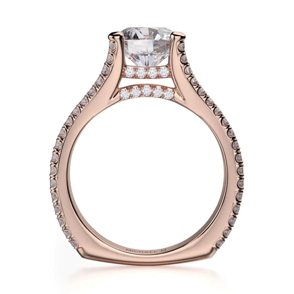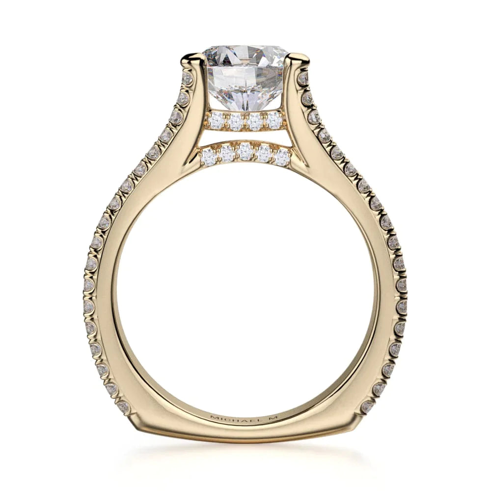 Immaculate Michael M engagement ring with stunning round center diamond setting. Adorned with over 0.69 carats of side diamonds. Crafted in exquisite 18-karat white gold for a timeless and elegant look.