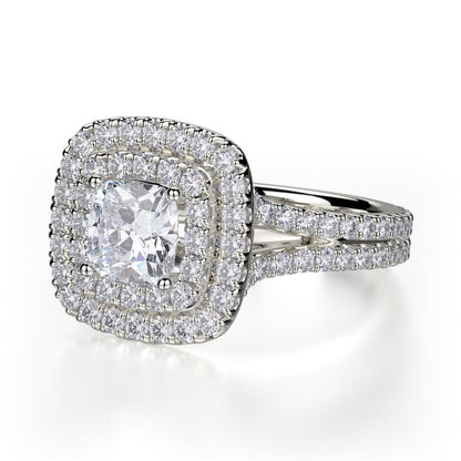 Immaculate Michael M engagement ring with cushion shaped center diamond setting. Adorned with over 0.68 carats of round cut side diamonds. Crafted in exquisite 18-karat white gold for a timeless and elegant look.