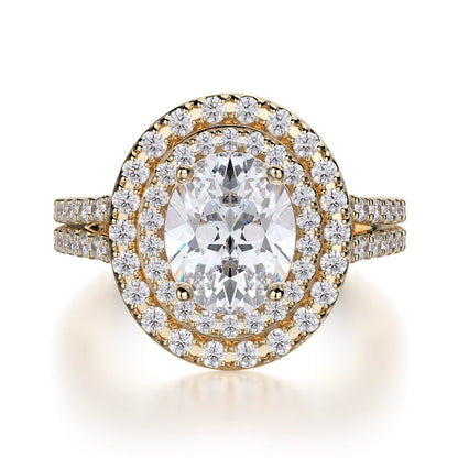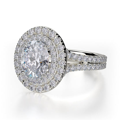Immaculate Michael M engagement ring with oval center diamond setting, fits 1.75-2.25 carats. Adorned with 0.78 carats of round cut side diamonds in elegant prong setting. Crafted with exquisite 18-karat white gold for lasting beauty.
