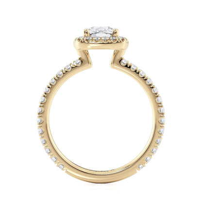 Elegant MICHAEL M engagement ring with cushion-cut center stone and u-set pave halo. Customizable designs with G color, VS clarity diamonds sourced responsibly. Contact Authorized Retail Partners for more information.