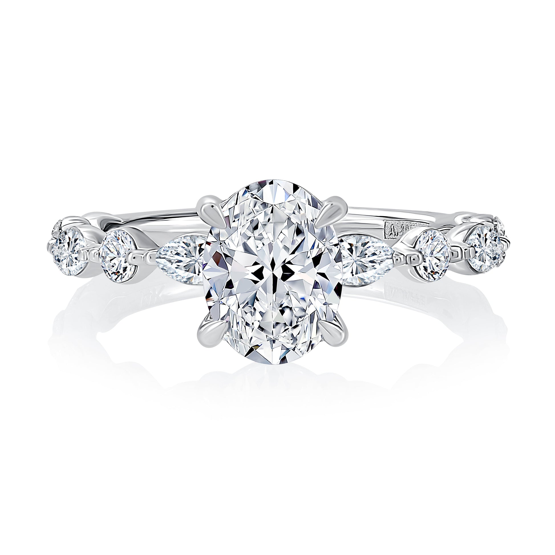 This floating alternating round and marquise diamond band features an oval center stone, complemented by a unique arrangement of alternating round and marquise diamonds. The design creates a modernn and sophisticated look, symbolizing both elegance and originality.