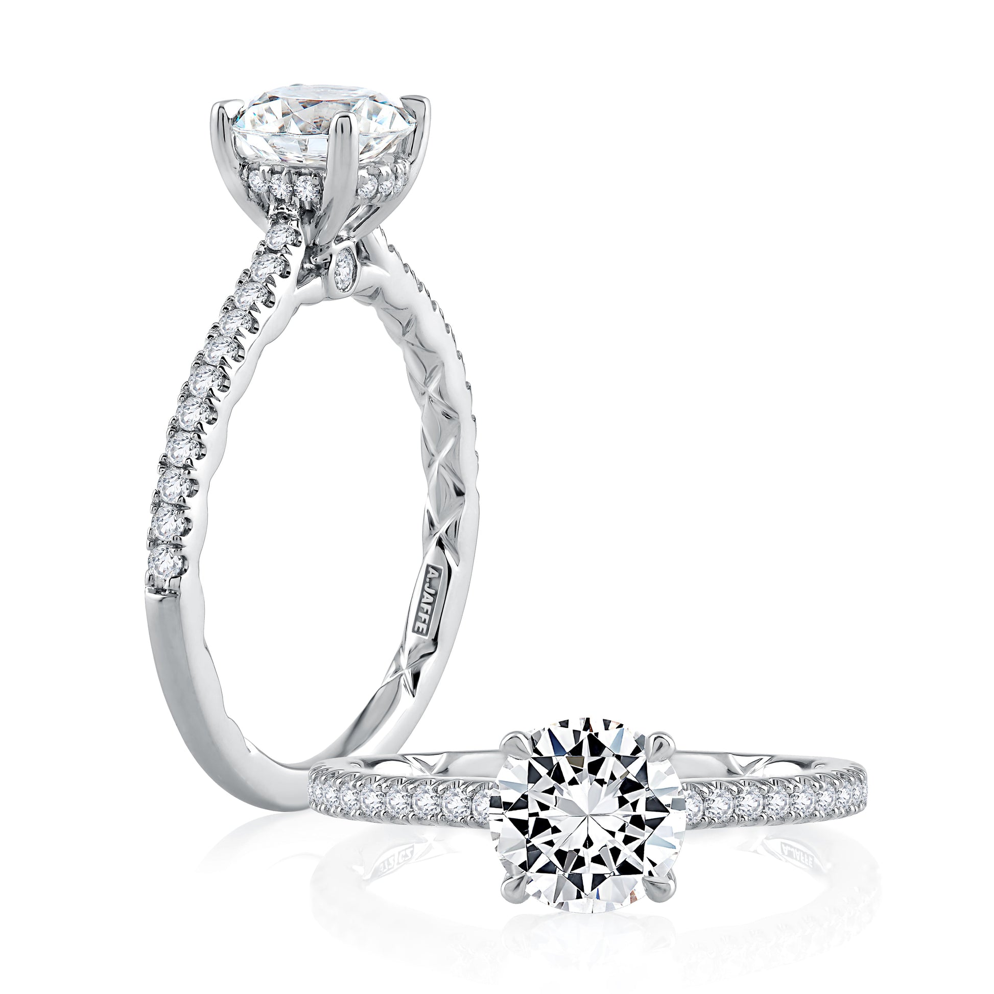 From the Classics Collection, this four prong engagement ring features a diamond band, diamond accent gallery, and the iconic A.JAFFE quilted shank.