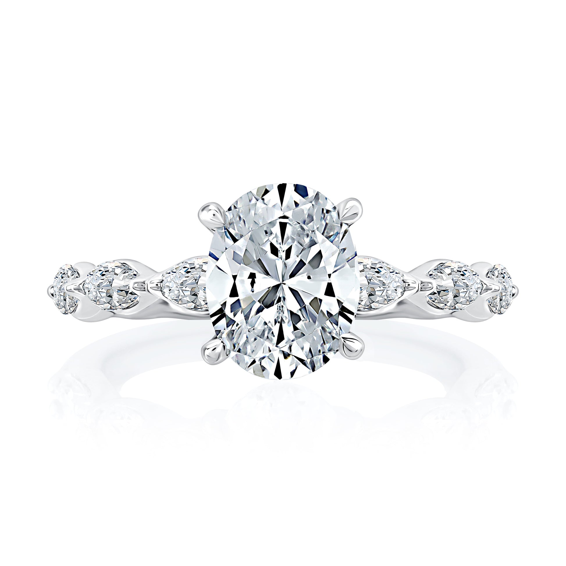 This engagement ring features a stunning oval center stone supported by four prongs. The marquise diamonds that envelop the band add to the overall brilliance of the ring. Made for the modern bride with a chic twist.