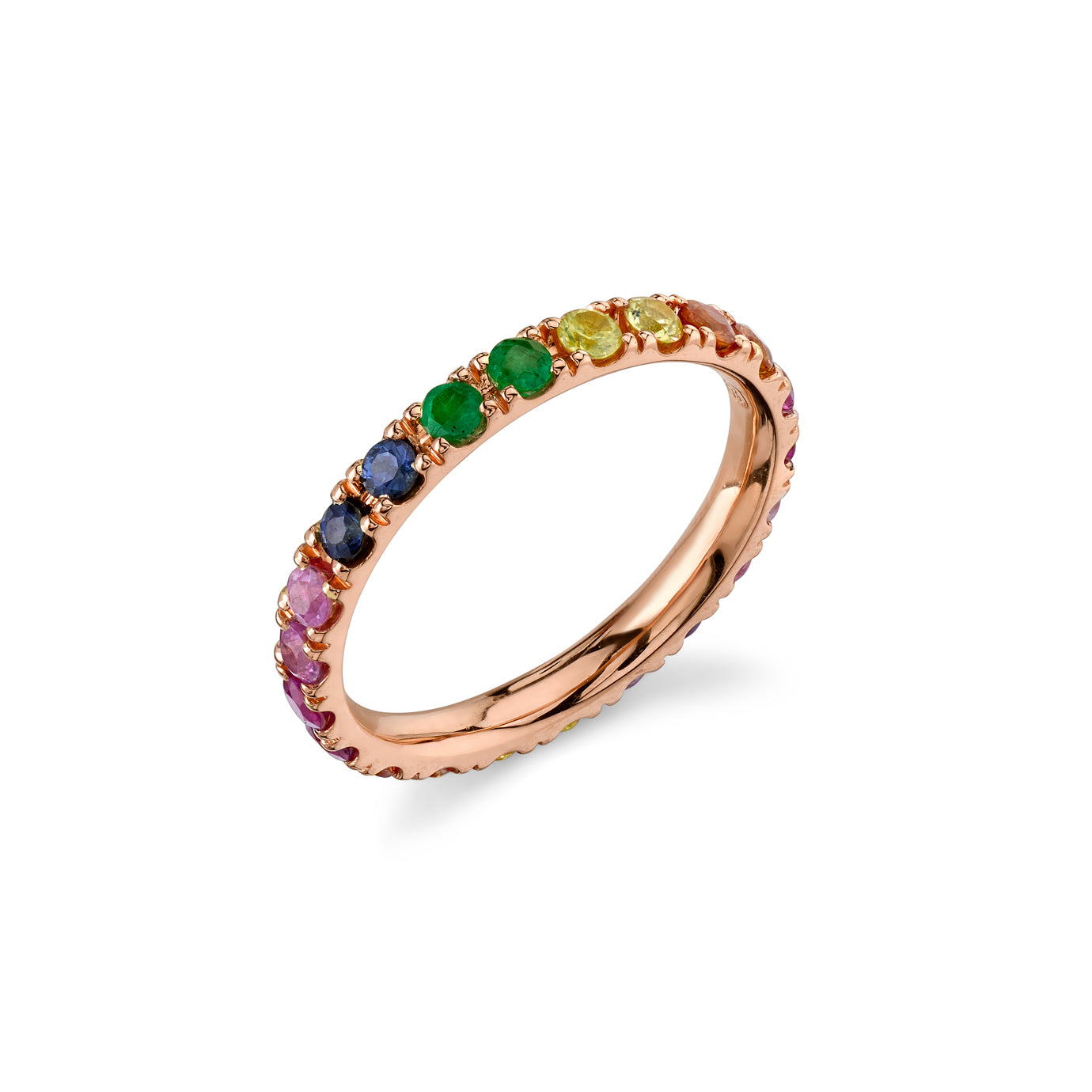 Elevate your style with our exquisite 14k gold eternity ring, adorned with pavé rubies, emeralds, and multi-color sapphires. This timeless piece is perfect for adding a touch of elegance to any ensemble.