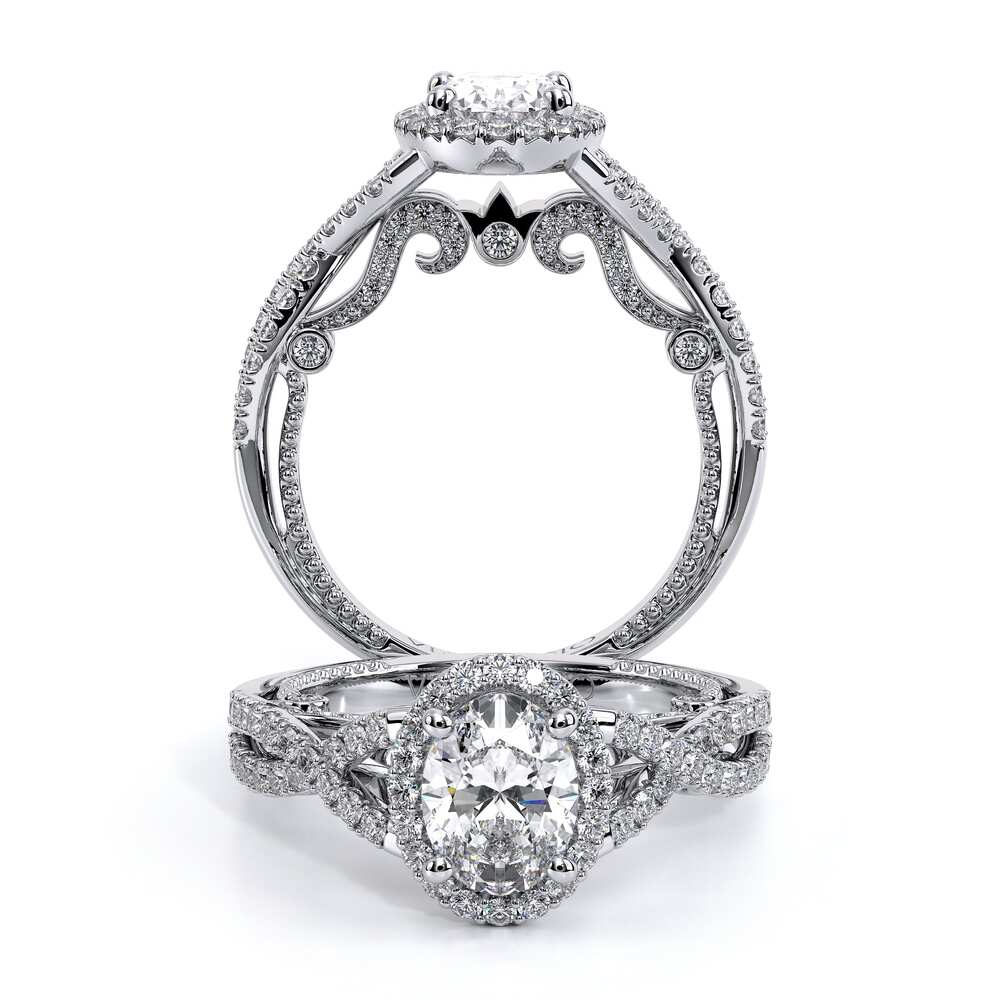 INSIGNIA-7070OV Oval halo engagement ring. Featuring, timeless pave' set round brilliant-cut diamonds on a twisted shank accompanied by Verragio's signature beading.