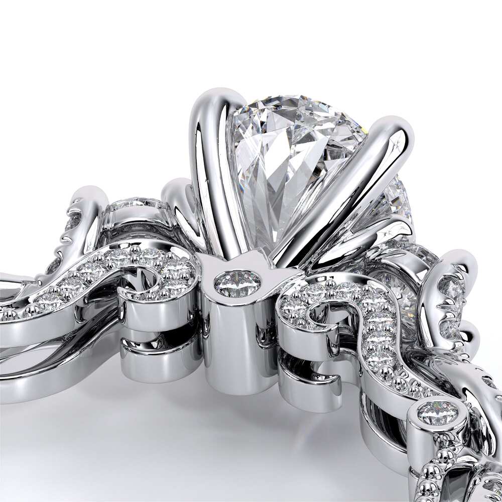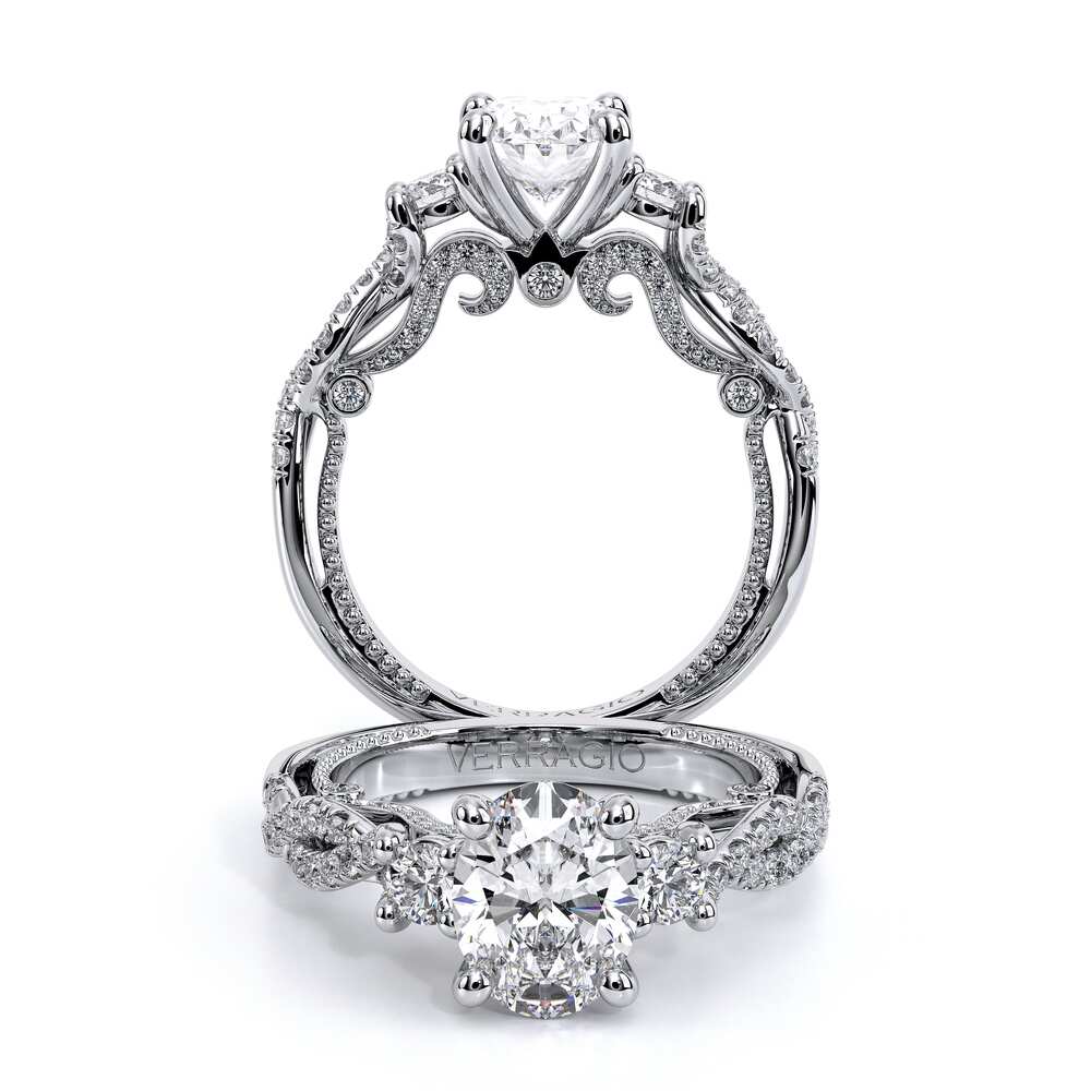 INSIGNIA-7074OV Three stone diamond engagement ring adorned with Verragio's signature beading, pave set brilliant-cut diamonds on Insignia's handcrafted scrollwork and twisted band. Refined to enhance a Oval diamond center.