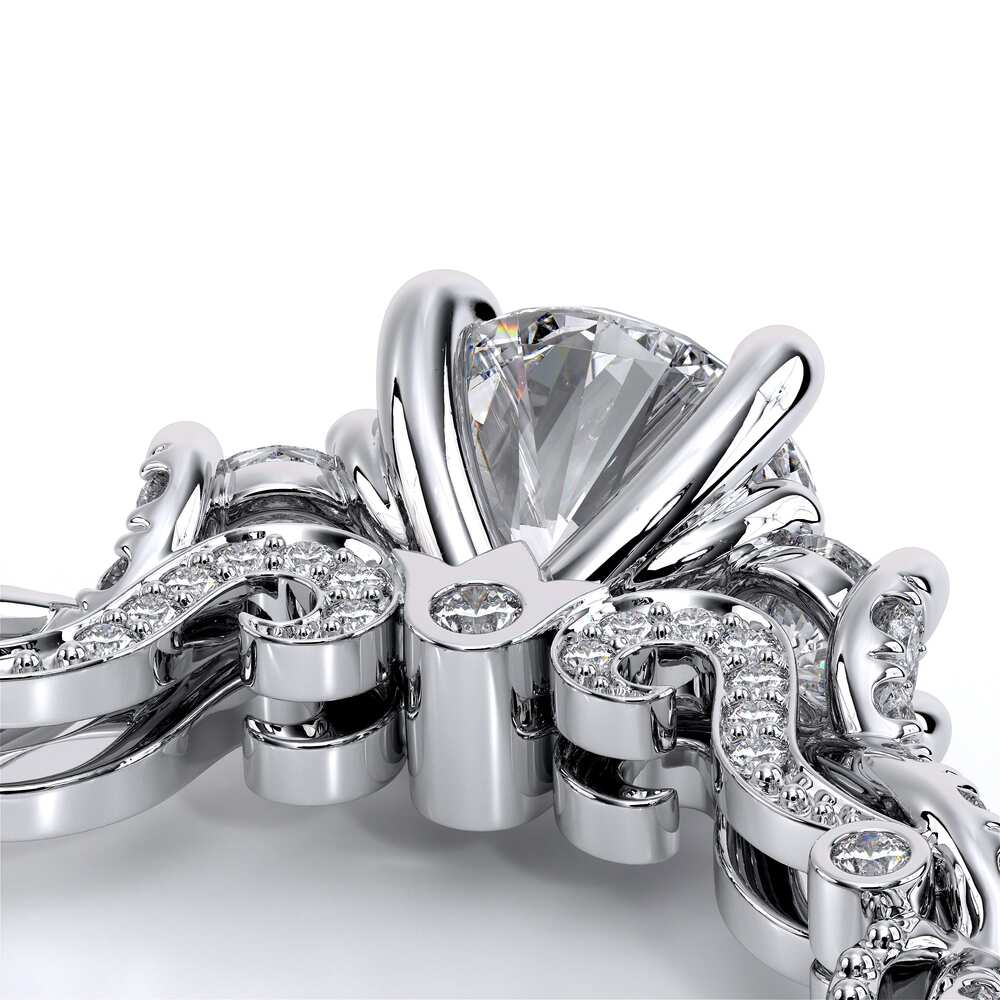 INSIGNIA-7074R Three stone diamond engagement ring adorned with Verragio's signature beading, pave set brilliant-cut diamonds on Insignia's handcrafted scrollwork and twisted band. Refined to enhance a Round diamond center.