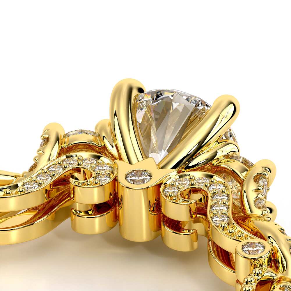 INSIGNIA-7074R Three stone diamond engagement ring adorned with Verragio's signature beading, pave set brilliant-cut diamonds on Insignia's handcrafted scrollwork and twisted band. Refined to enhance a Round diamond center.