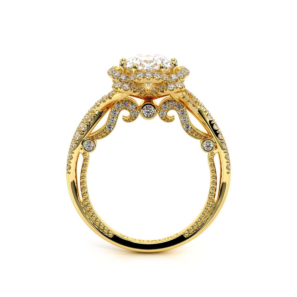 INSIGNIA-7087OV Featuring, Verragio's uniquely designed handcrafted floret halo that is adorned with meticulously set round pave brilliant-cut diamonds on a twisted band. Encompassed by Insignia's handcrafted diamond scrollwork and Verragio's signature beading to enhance a Oval diamond center.