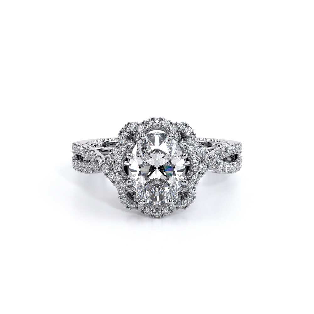 INSIGNIA-7087OV Featuring, Verragio's uniquely designed handcrafted floret halo that is adorned with meticulously set round pave brilliant-cut diamonds on a twisted band. Encompassed by Insignia's handcrafted diamond scrollwork and Verragio's signature beading to enhance a Oval diamond center.