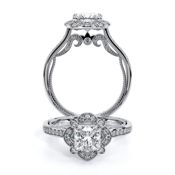 Elevate your special moment with the Verragio Women's Engagement Ring with Matching Wedding Band, the INSIGNIA-7094W. This vintage piece from the elegant INSIGNIA collection features a Fiore diamond halo and intricate diamond Insignia scrollwork, perfect for showcasing a center stone of up to 2.00ct Princess.