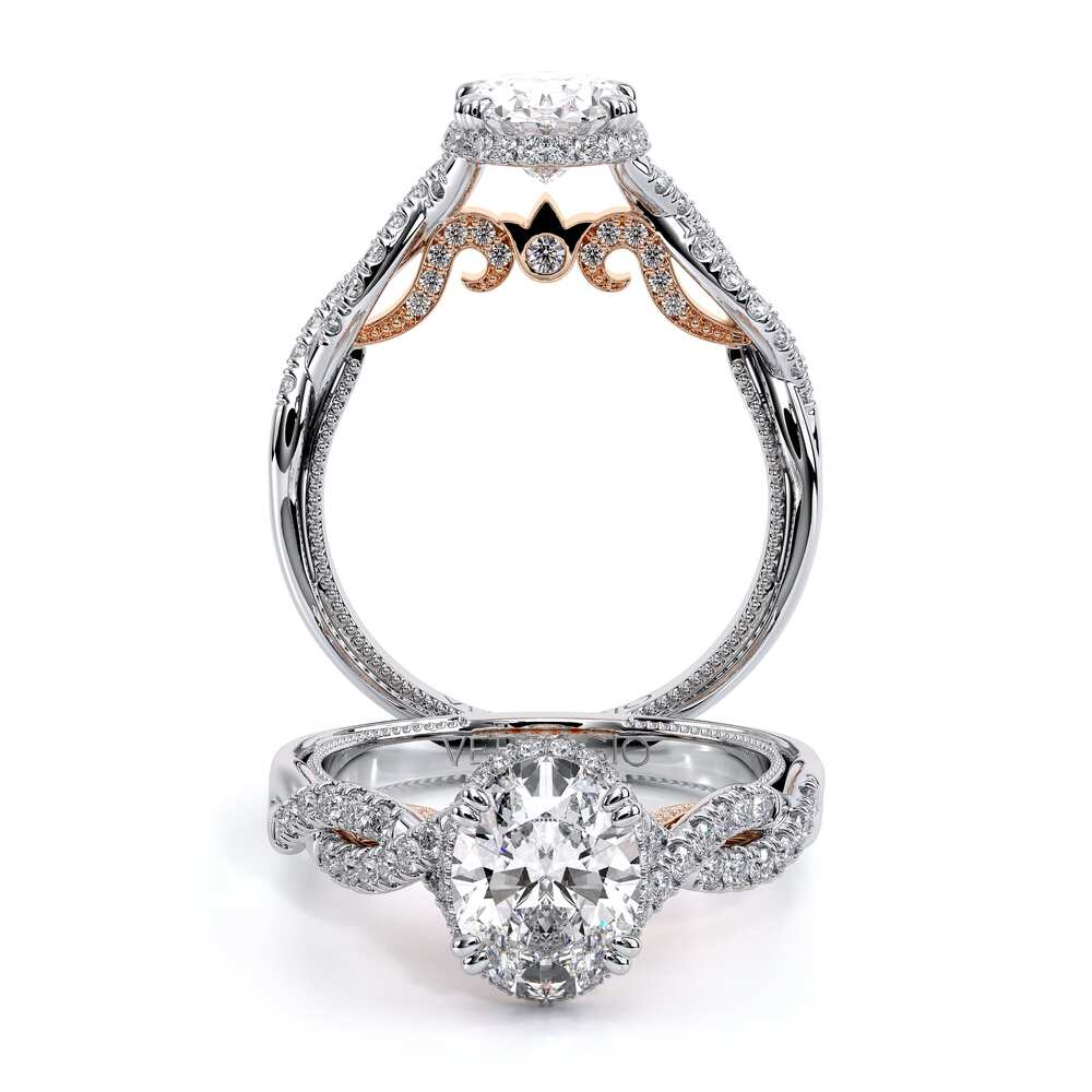 INSIGNIA-7099OV oval engagement ring featuring Verragio's handcrafted stardust halo adorned with meticulously set round brilliant-cut diamonds atop a twisted band. Accompanying diamond Insignia scrollwork refined with Verragio's timeless signature crest and beading.