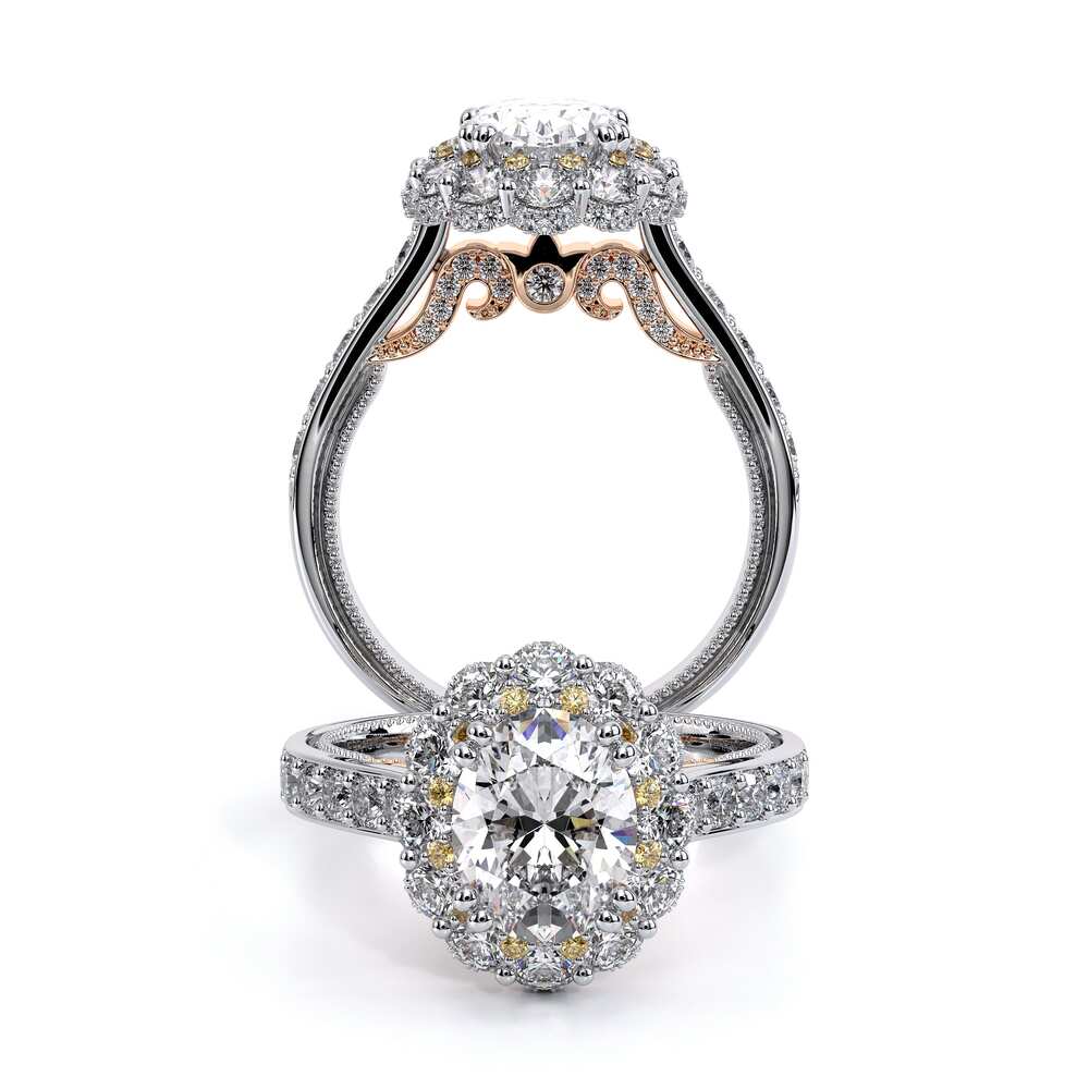 INSIGNIA-7106OV Features our prestigious Enchanted Diamond Halo®, creating a truly unique engagement ring designed to emphasize your oval diamond center. Verragio's timeless signature beading along side Insignia's handcrafted diamond scrollwork are all details adding to the beauty and lure of this ring.