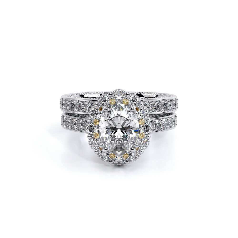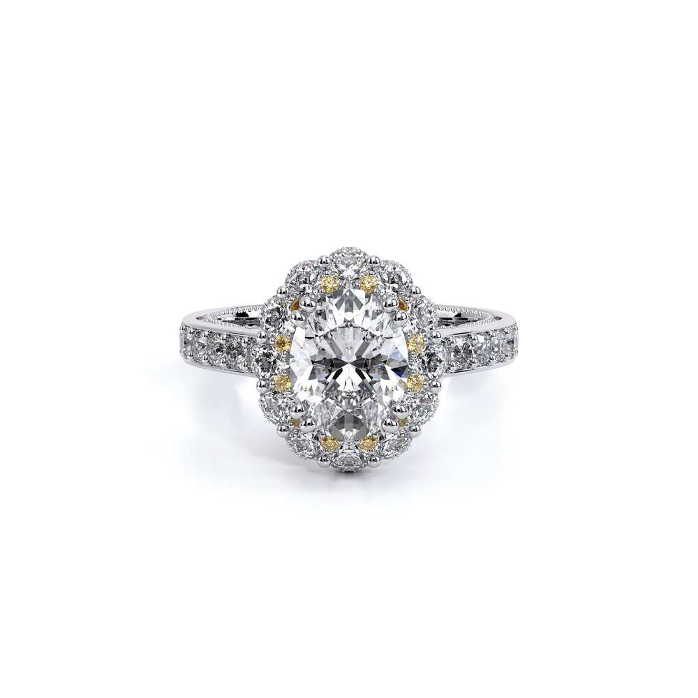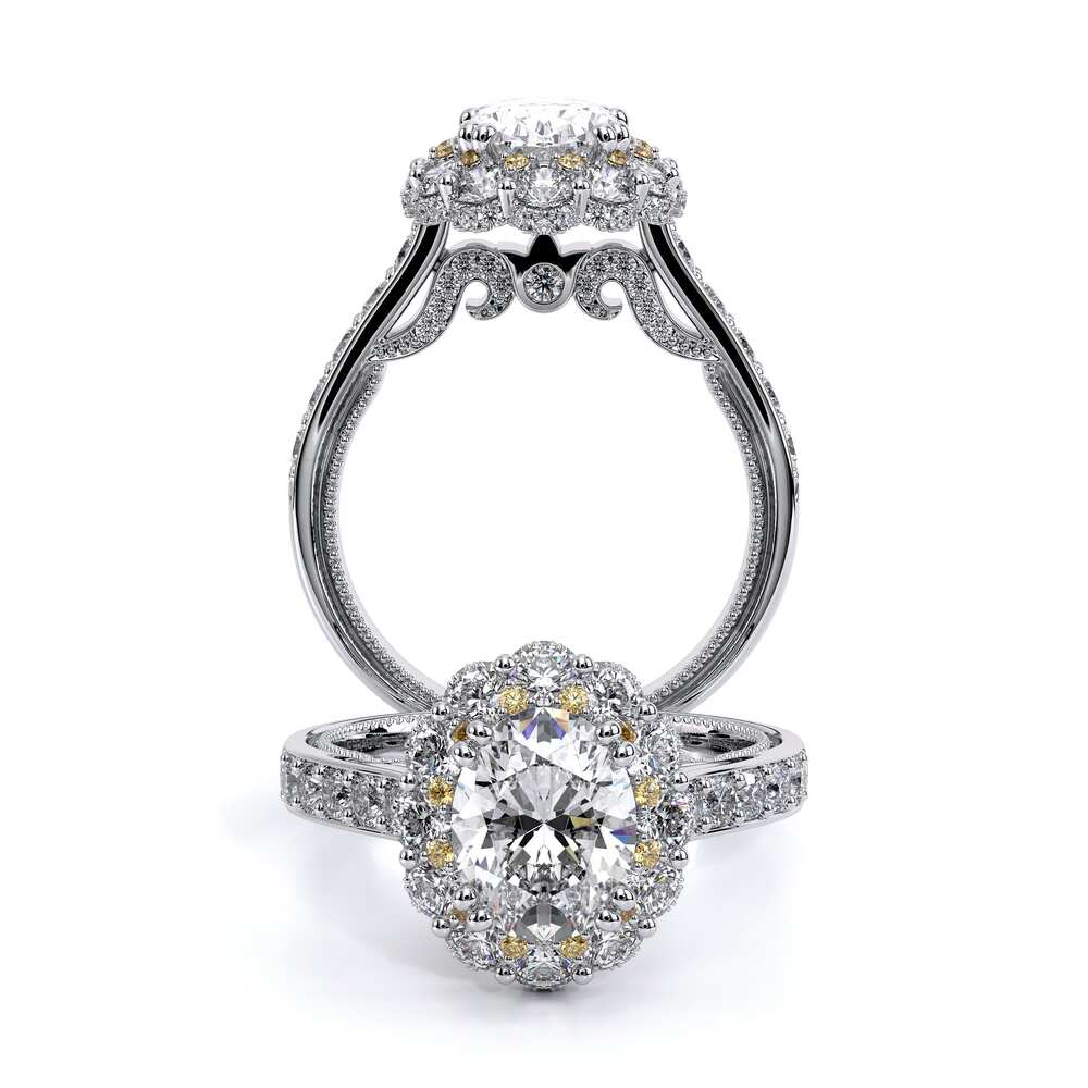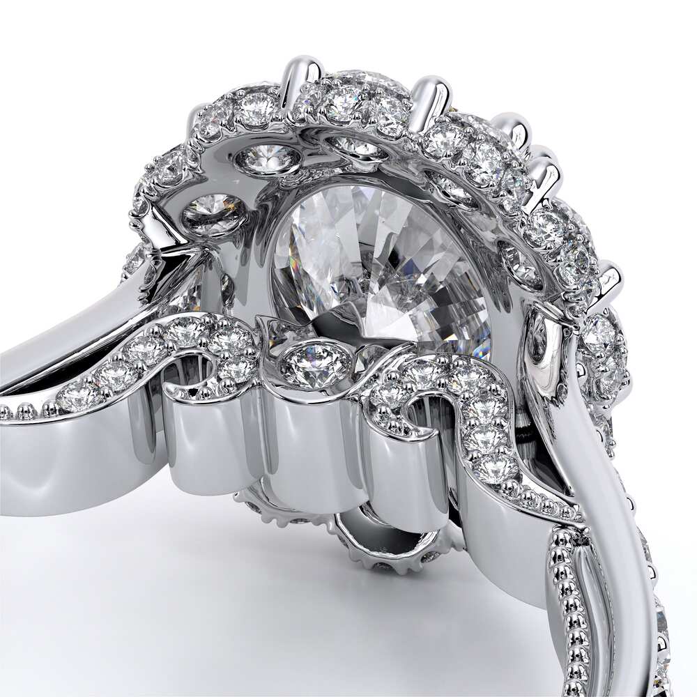 INSIGNIA-7106OV Features our prestigious Enchanted Diamond Halo®, creating a truly unique engagement ring designed to emphasize your oval diamond center. Verragio's timeless signature beading along side Insignia's handcrafted diamond scrollwork are all details adding to the beauty and lure of this ring.
