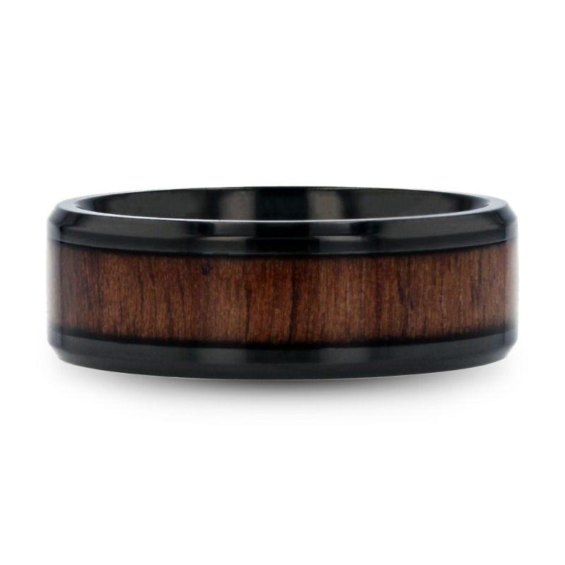 KONY Black Titanium Polished Beveled Edges Black Walnut Wood Inlaid Men's Wedding Ring - 6mm & 8mm