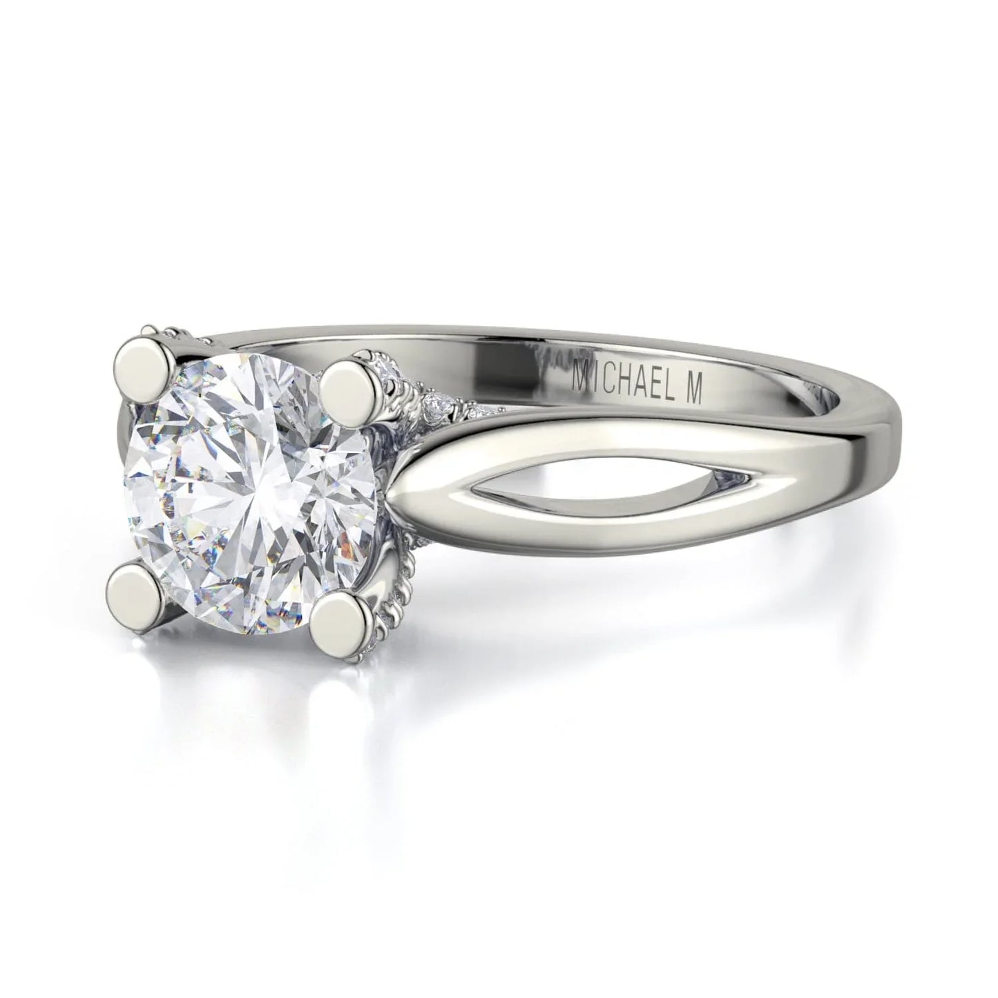 Immaculate Michael M engagement ring with stunning round center diamond setting. Adorned with over 0.21 carats of side diamonds. Crafted with exquisite 18-karat white gold for a timeless and elegant look.