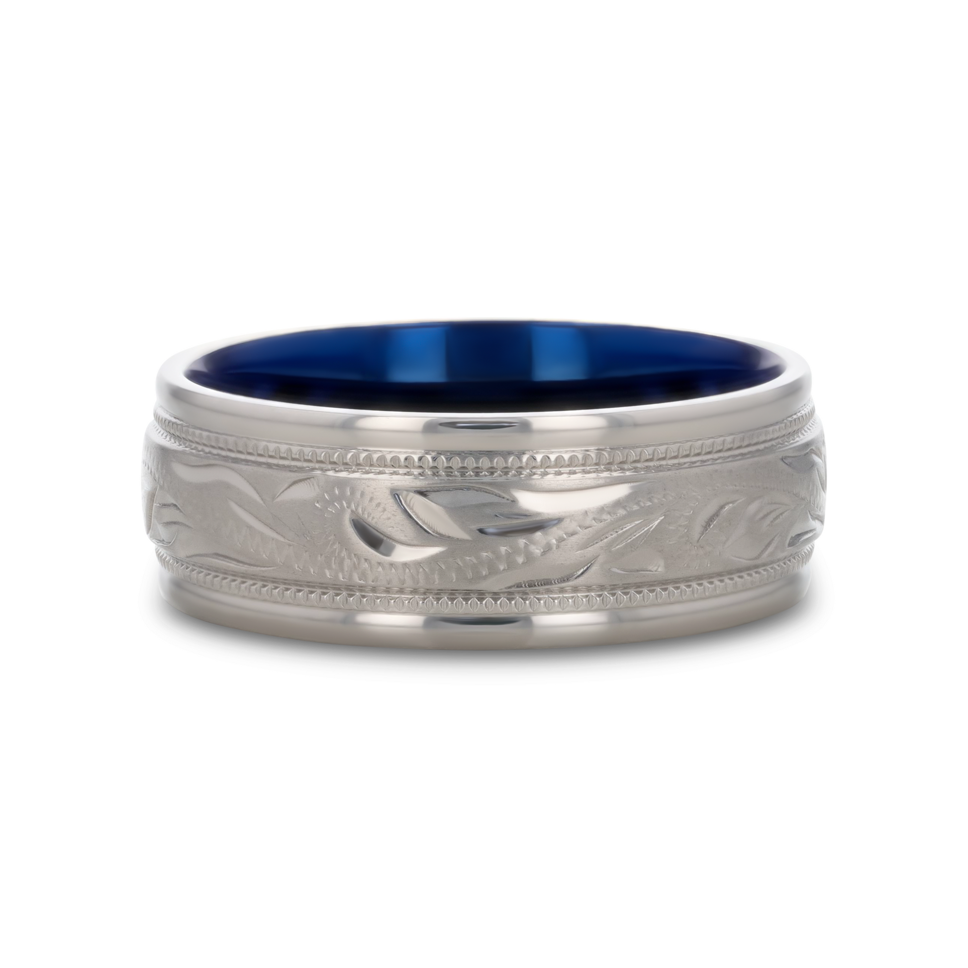 MARINER Titanium Milgrain Engraved Finish Men's Wedding Ring with Blue Plating Inside - 8mm