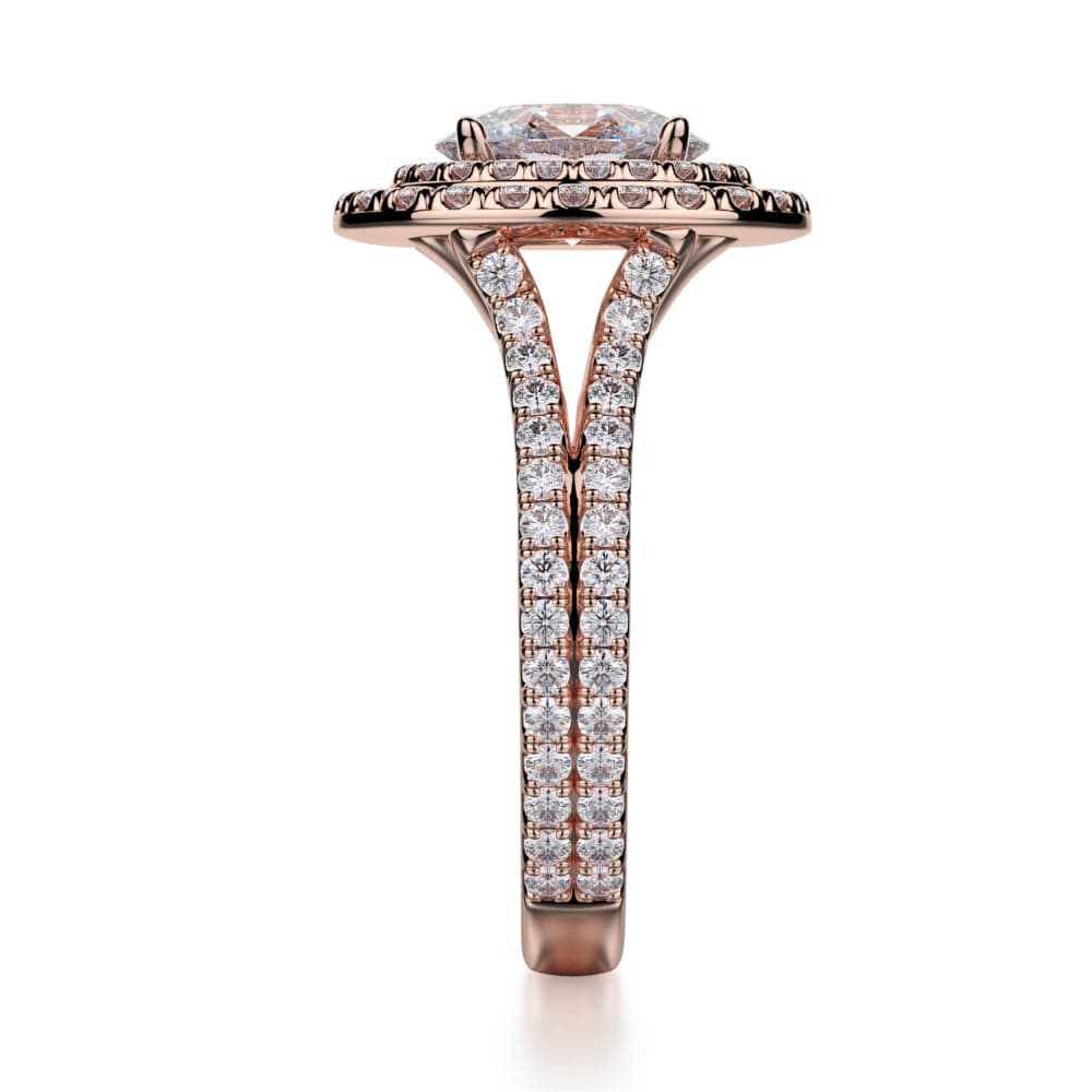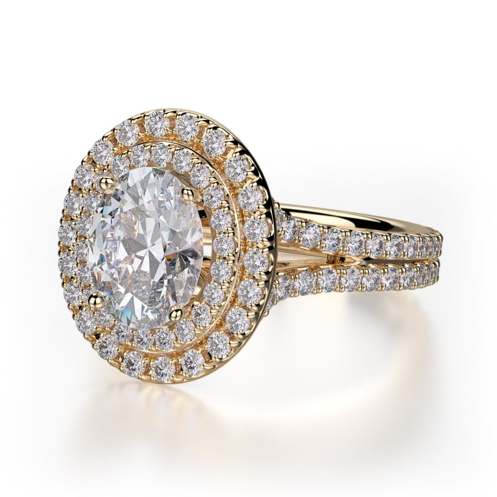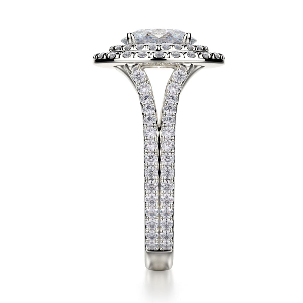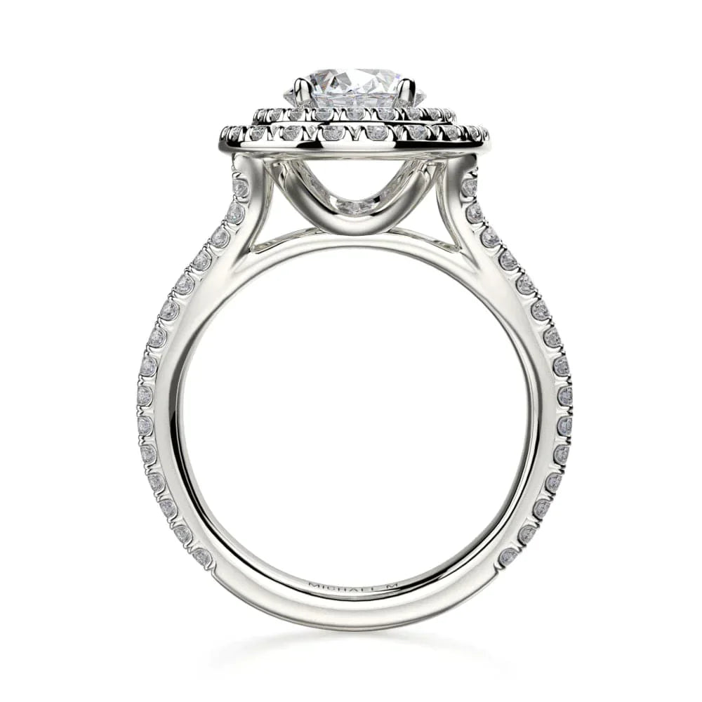 Immaculate Michael M engagement ring with oval center diamond setting, fits 1.75-2.25 carats. Adorned with 0.78 carats of round cut side diamonds in elegant prong setting. Crafted with exquisite 18-karat white gold for lasting beauty.