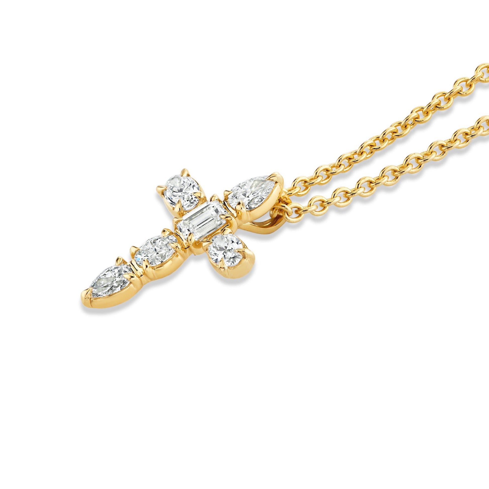 The Montage Small Diamond Cross Pendant features a stunning combination of Montage mixed cut diamonds and emeralds, accented with pear, emerald and oval cut diamonds. The result is a timeless piece of jewelry that offers a unique blend of elegance and sparkle. With the addition of high-quality materials and careful craftsmanship, this pendant is built to last and make a statement for years to come.