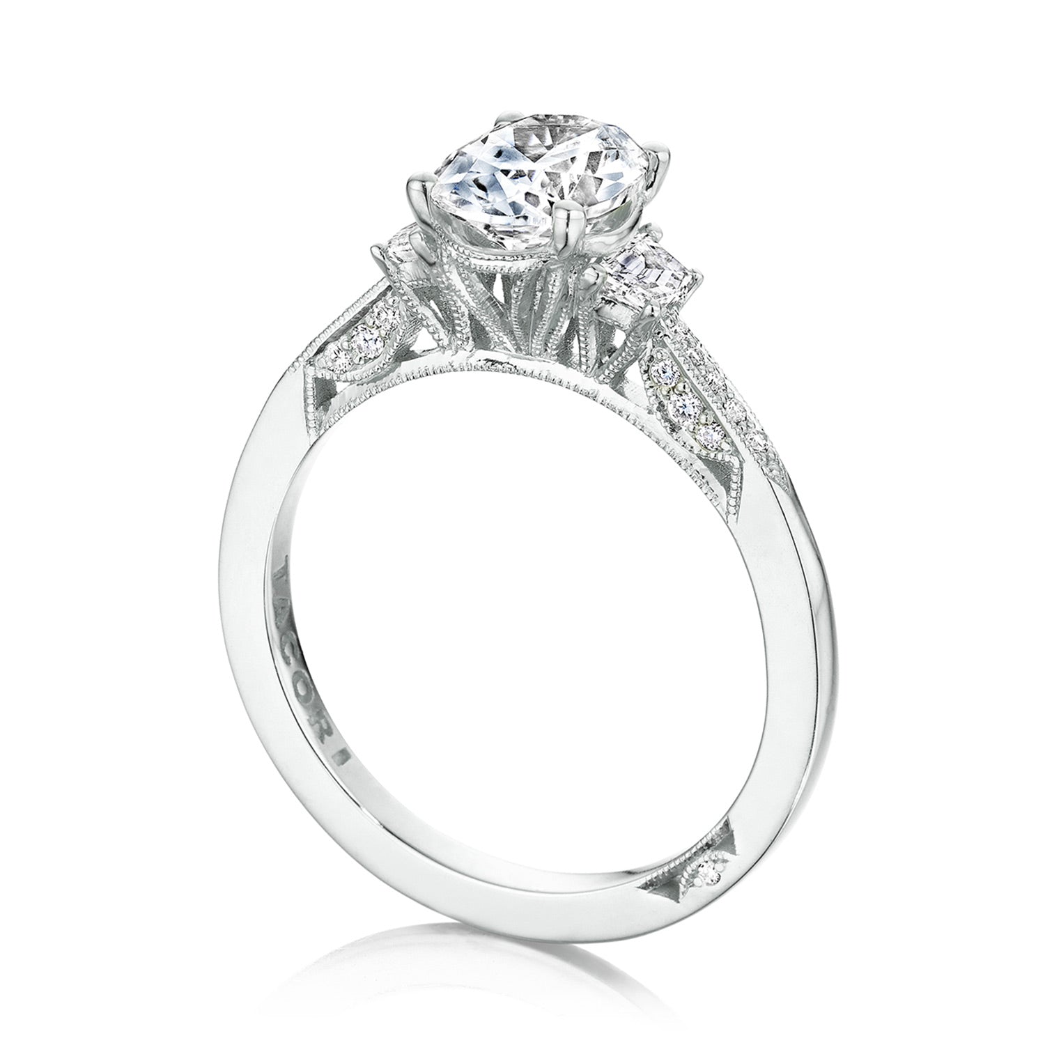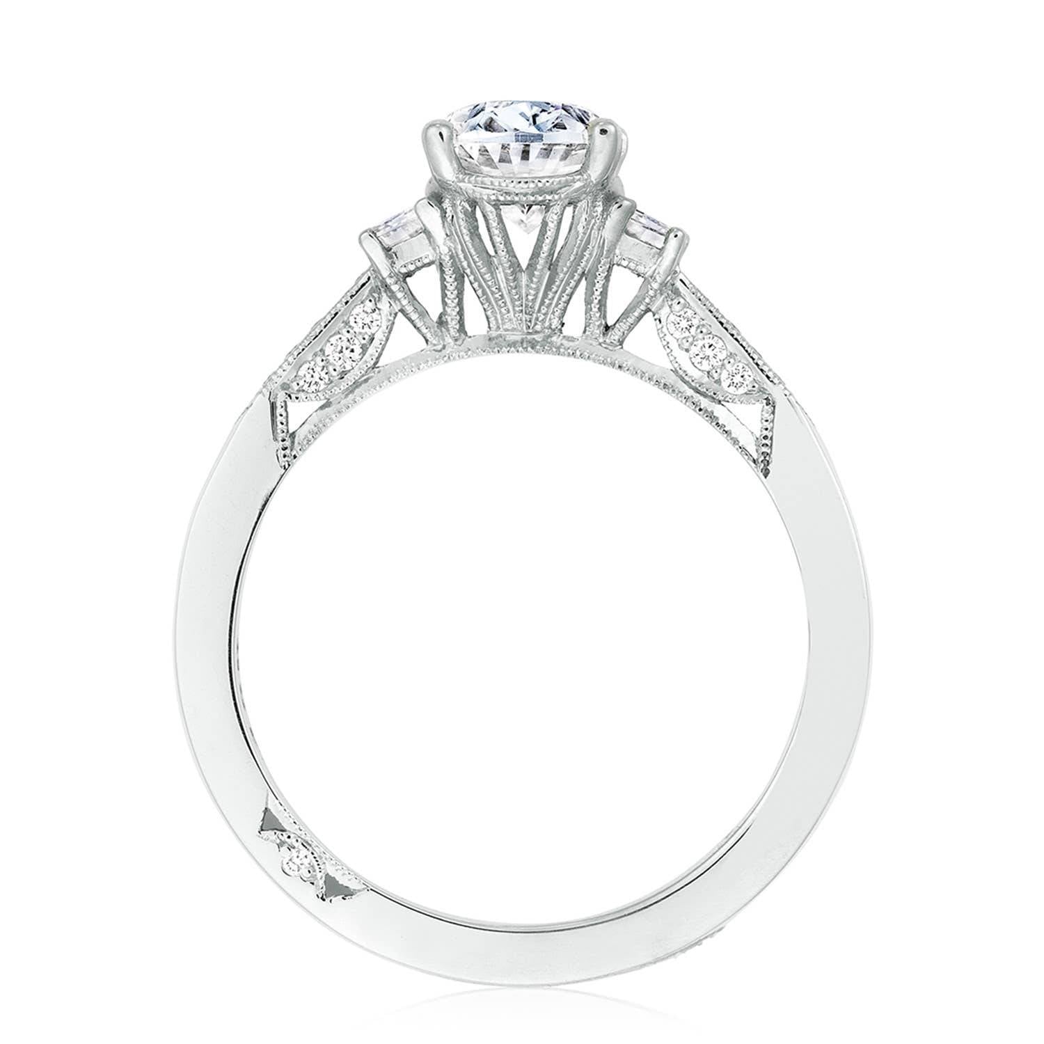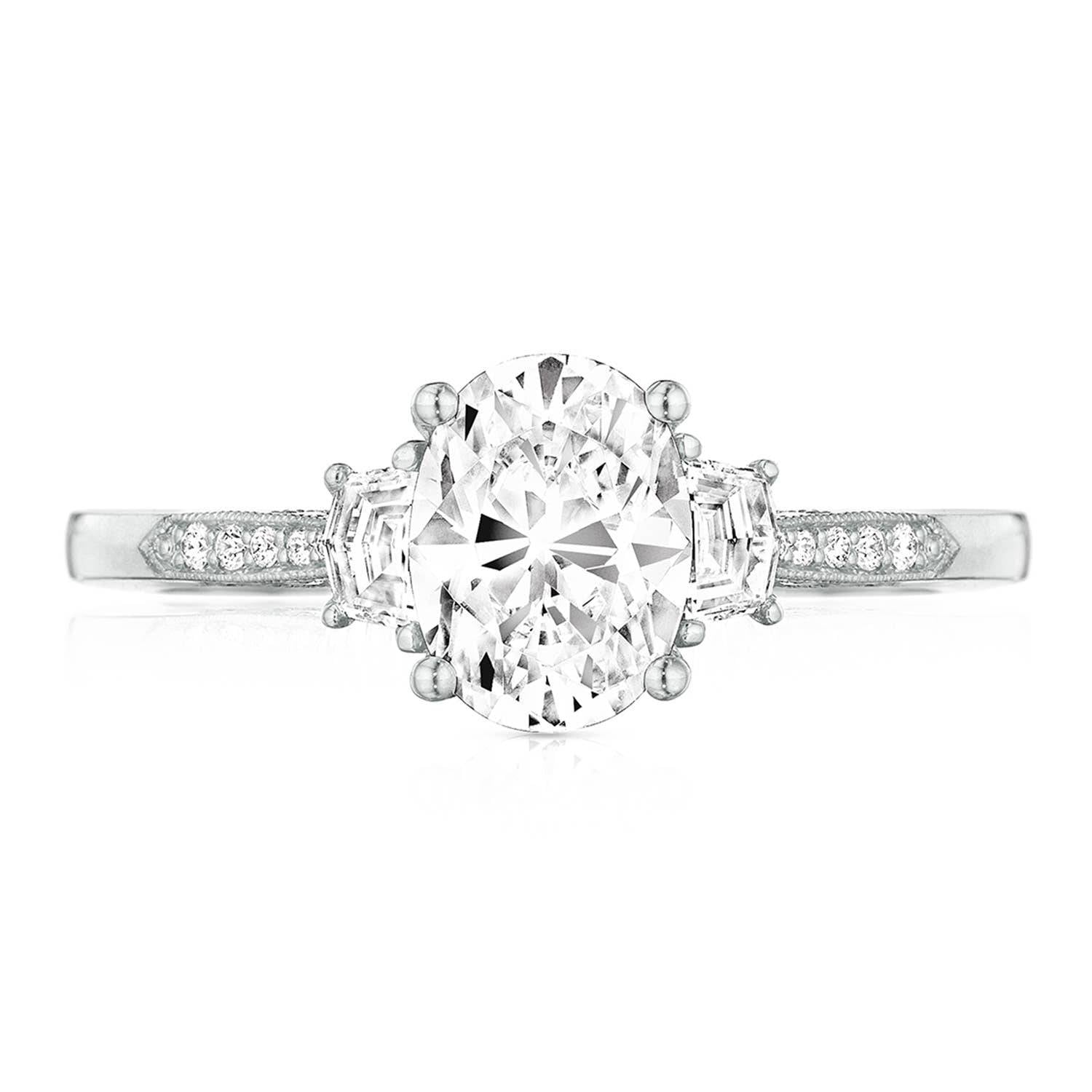Simply stunning, simply Tacori. A traditionally elegant picture-frame prong outlines your oval center, which is further brought to life by two high-intensity cadillac side stones on a high polished band with pavé diamond detailing.