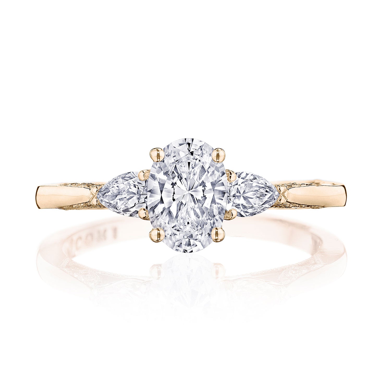 Let your diamond engagement ring stand out by contrasting your side stones with your center diamond! Pear-shaped side stones graduate to the oval center, bringing a magical contrast to bring about beauty from every angle.