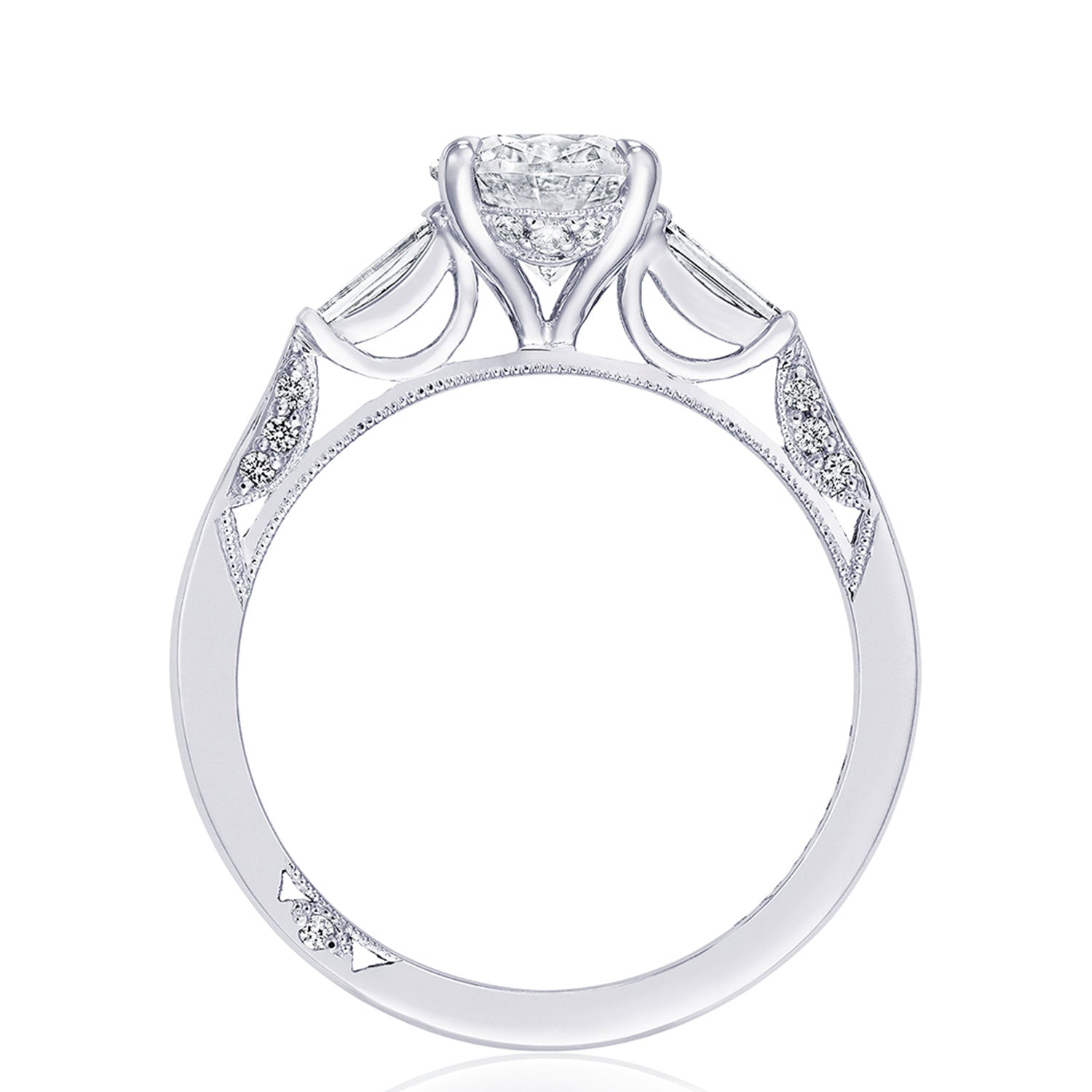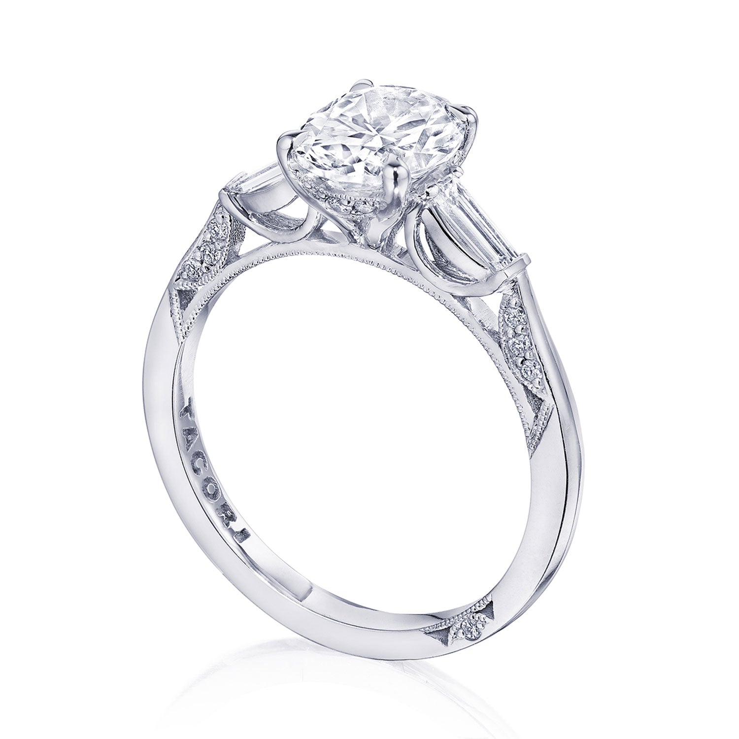Let your diamond engagement ring stand out by contrasting your side stones with your center diamond! Baguette side stones graduate to the oval center, bringing a magical contrast to bring about beauty from every angle.