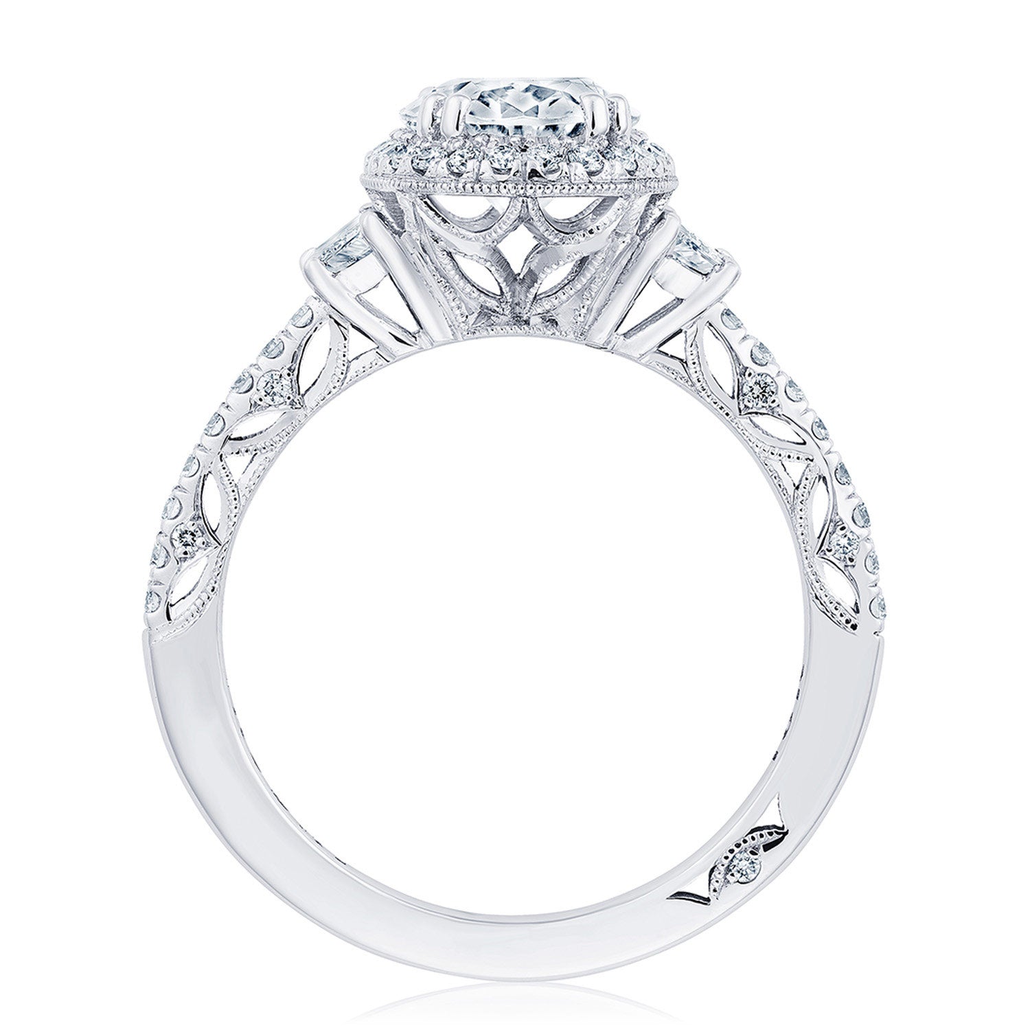 This elegant three-stone setting is exceptionally detailed. A Spotlight Bloom with radiant Cadillac side stones sit atop a meticulous French pavé band with lace-like, milgrain-edged Dantela Crescent Fabric.
