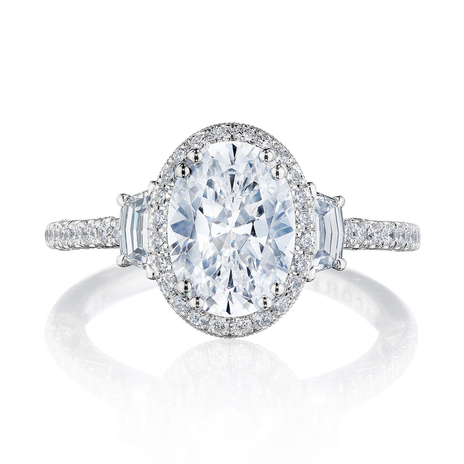 This elegant three-stone setting is exceptionally detailed. A Spotlight Bloom with radiant Cadillac side stones sit atop a meticulous French pavé band with lace-like, milgrain-edged Dantela Crescent Fabric.