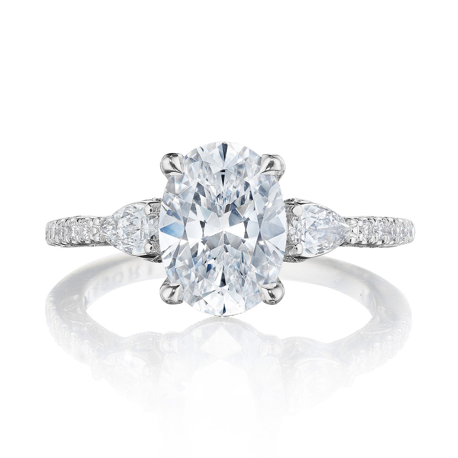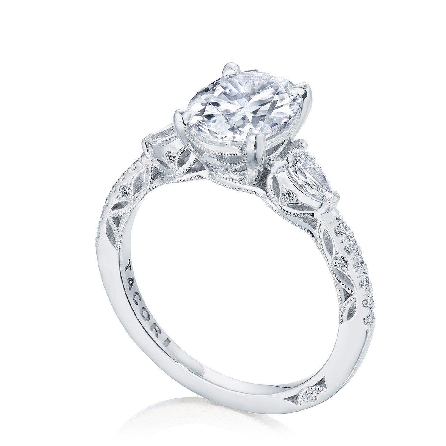 This three stone ring features distinctive pear side stones that sit atop a lace-like crown and foundation of complex, milgrain-edged Dantela Crescent Fabric. Meticulous, hand-set French pavé leads up the ceiling for eye-catching brilliance.