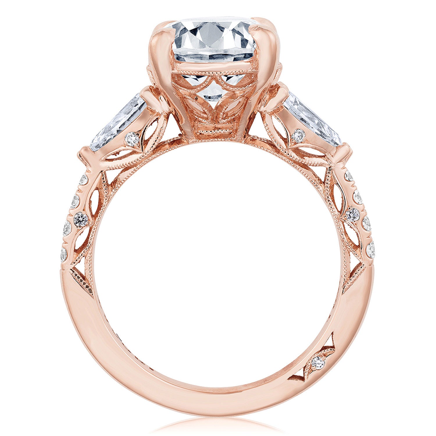 This three stone ring features distinctive pear side stones that sit atop a lace-like crown and foundation of complex, milgrain-edged Dantela Crescent Fabric. Meticulous, hand-set French pavé leads up the ceiling for eye-catching brilliance.