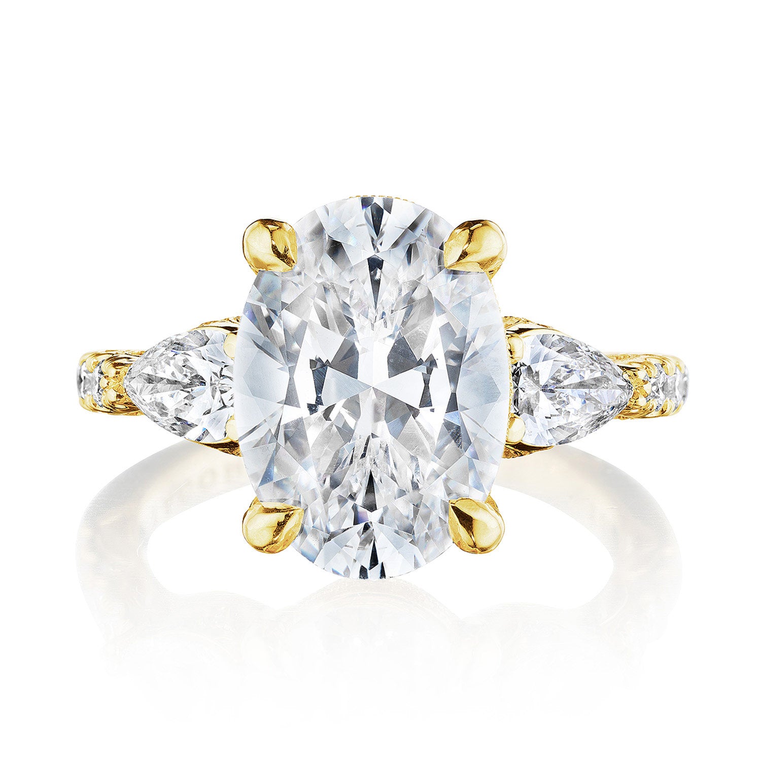 This three stone ring features distinctive pear side stones that sit atop a lace-like crown and foundation of complex, milgrain-edged Dantela Crescent Fabric. Meticulous, hand-set French pavé leads up the ceiling for eye-catching brilliance.