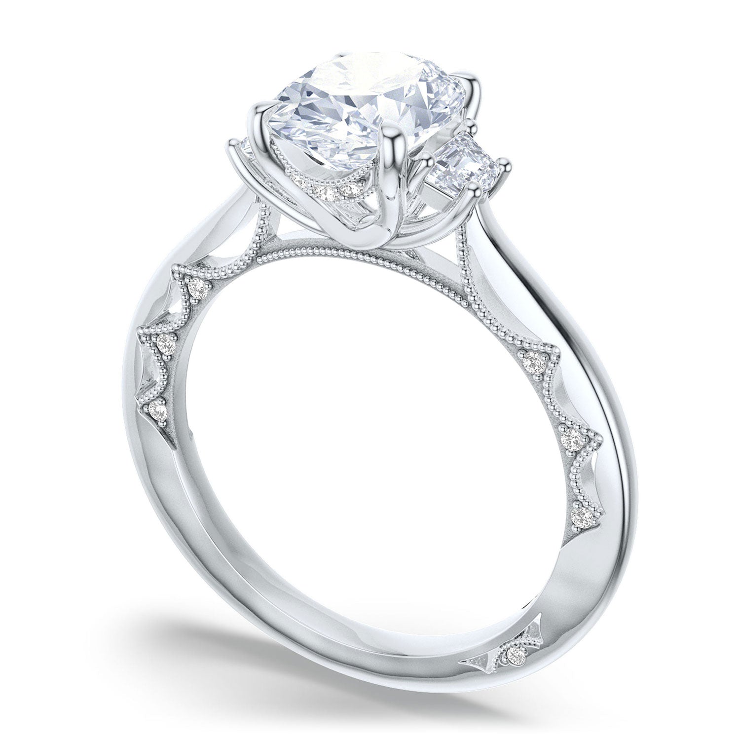Milgrain-edged Crescents create radiant windows of light, while round-brilliant diamonds at each Crescent junction are hand-set with triple beading. A high polish ceiling leads towards the three-stone crown with a hidden bloom.