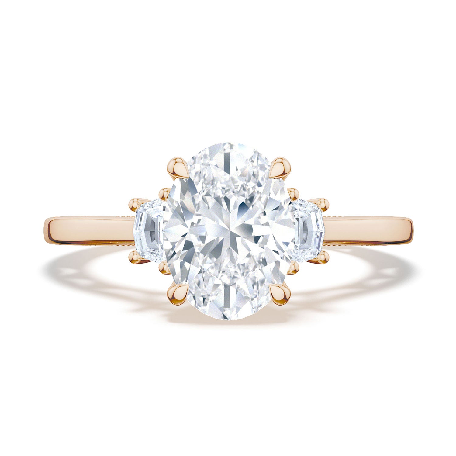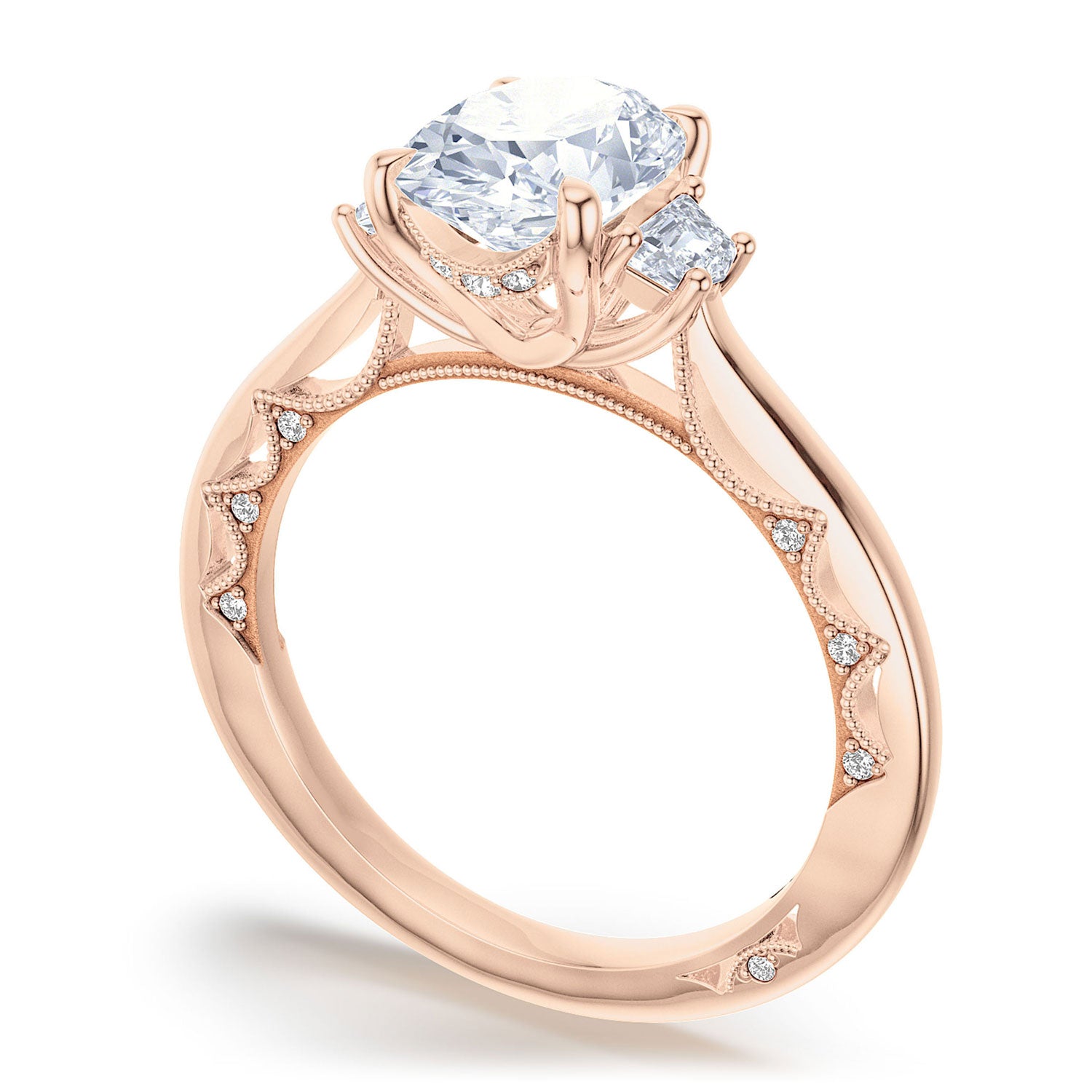 Milgrain-edged Crescents create radiant windows of light, while round-brilliant diamonds at each Crescent junction are hand-set with triple beading. A high polish ceiling leads towards the three-stone crown with a hidden bloom.