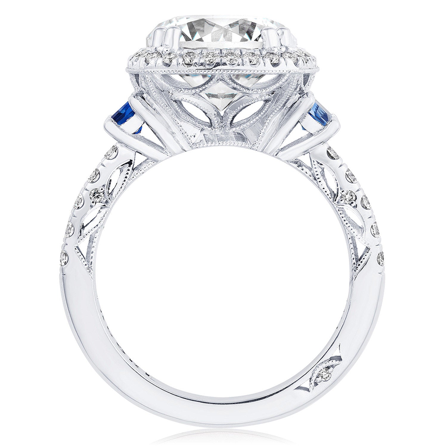 This elegant three-stone setting is exceptionally detailed. A Spotlight Bloom with blue sapphire Cadillac-cut side stones sit atop a meticulous French pavé band enhanced by the lace-like, Dantela Crescent Fabric.