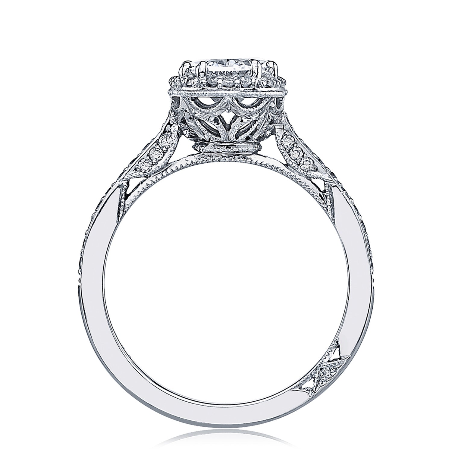 For a woman with an eye for glamour, this ring is sublime. Round spotlight diamonds encircle an oval center with diamonds both along the ceiling and on the sides, for lustrous shine from all angles.