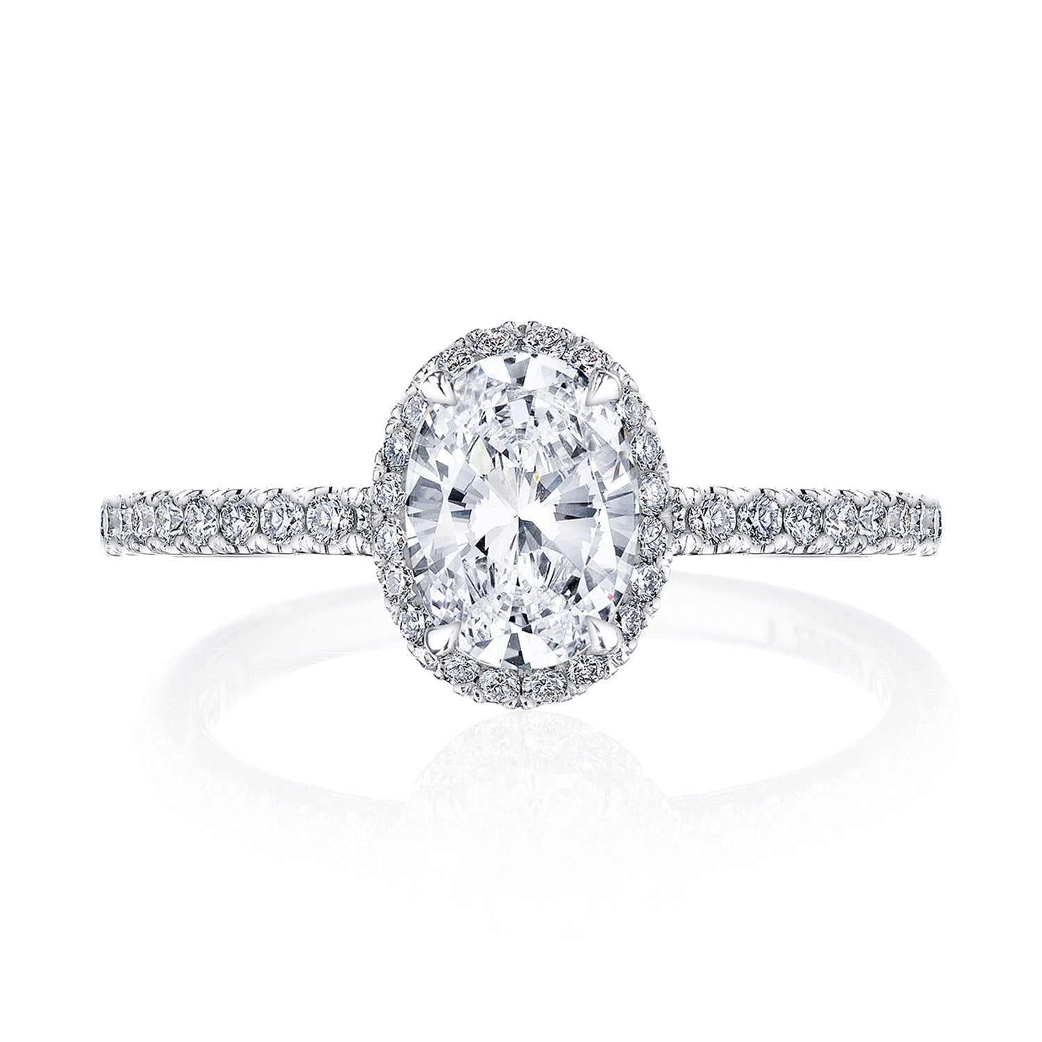 A thin, Simply Tacori Classic 360 foundation that delivers brilliant detail, crowned with an oval cut center and oval shaped bloom. Truly Tacori and totally lovely.