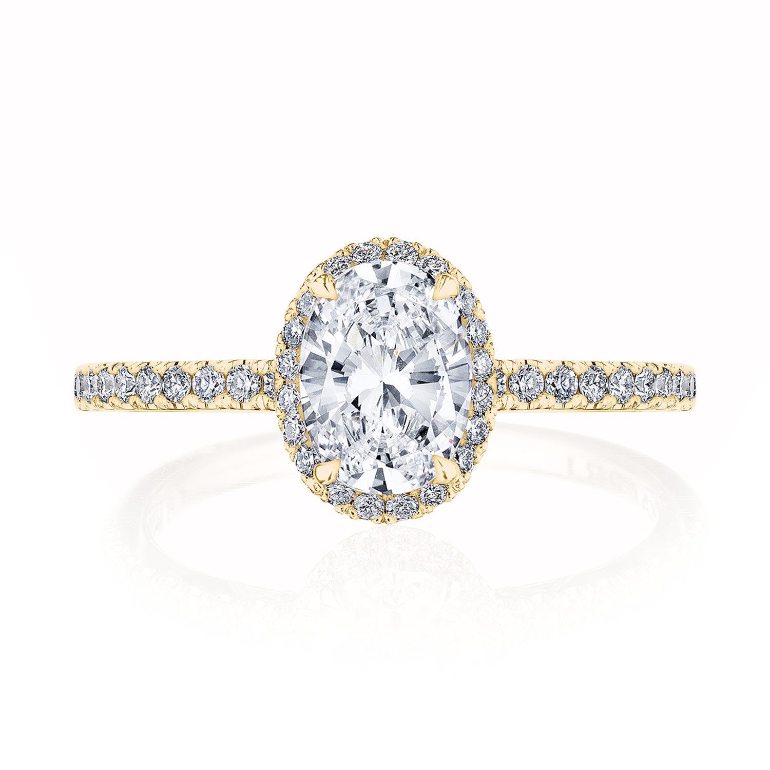 A thin, Simply Tacori Classic 360 foundation that delivers brilliant detail, crowned with an oval cut center and oval shaped bloom. Truly Tacori and totally lovely.