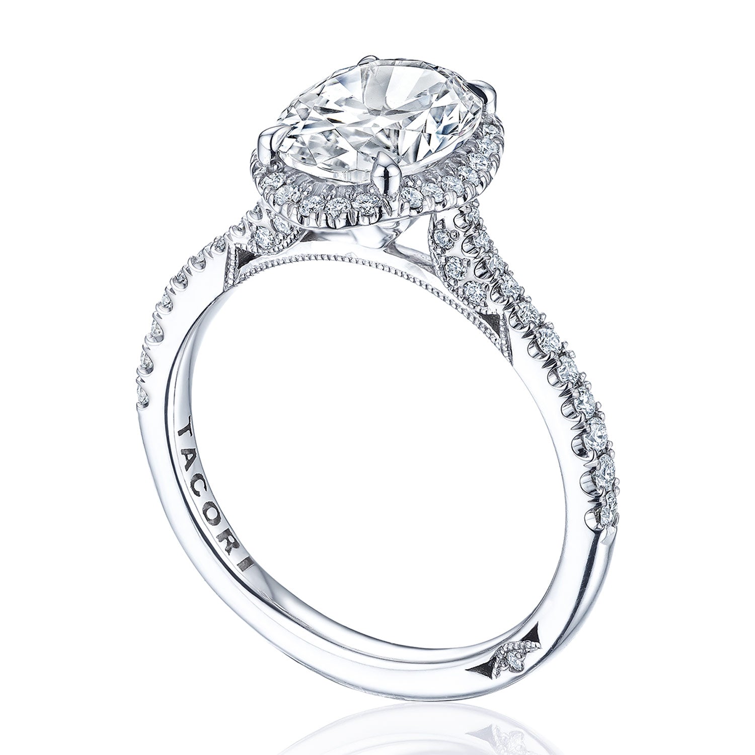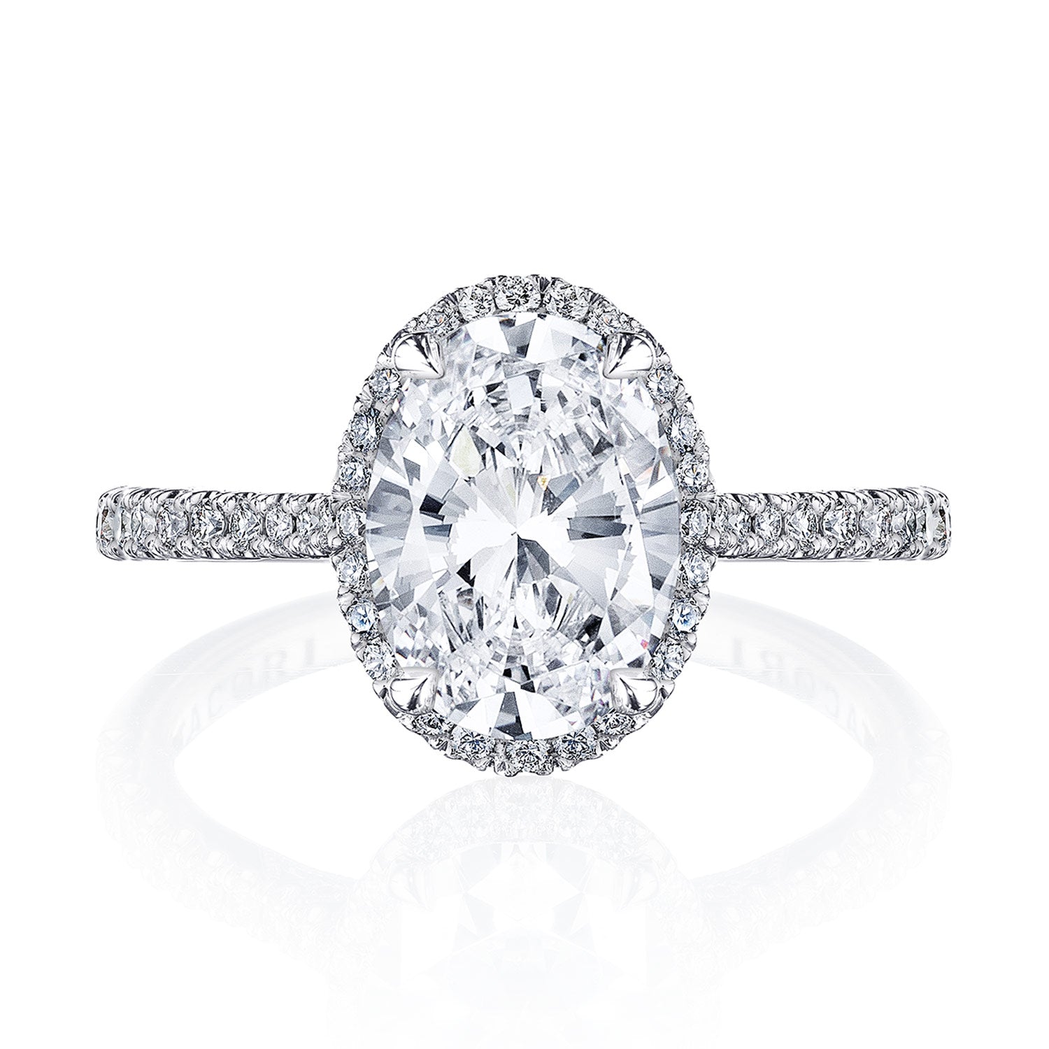 A thin, Simply Tacori Cathedral foundation that delivers brilliant detail, crowned with an oval cut center and oval shaped bloom. Truly Tacori and totally lovely.