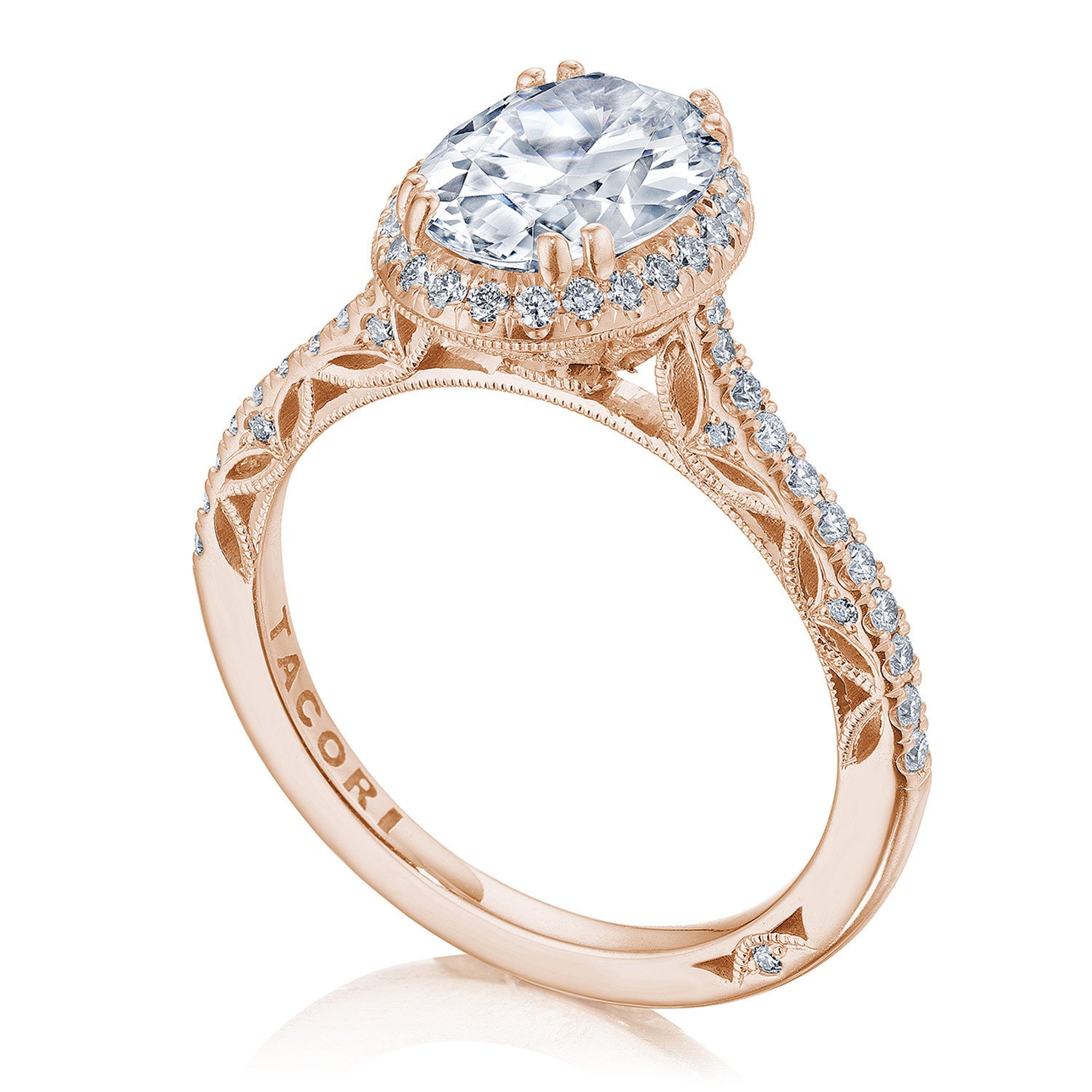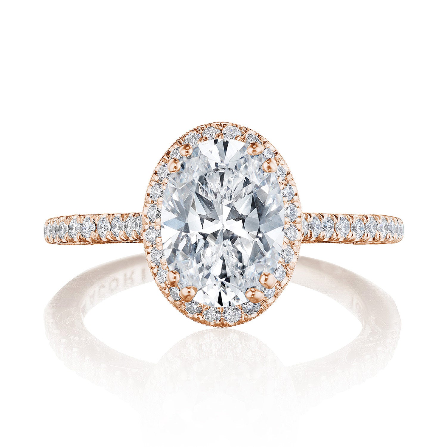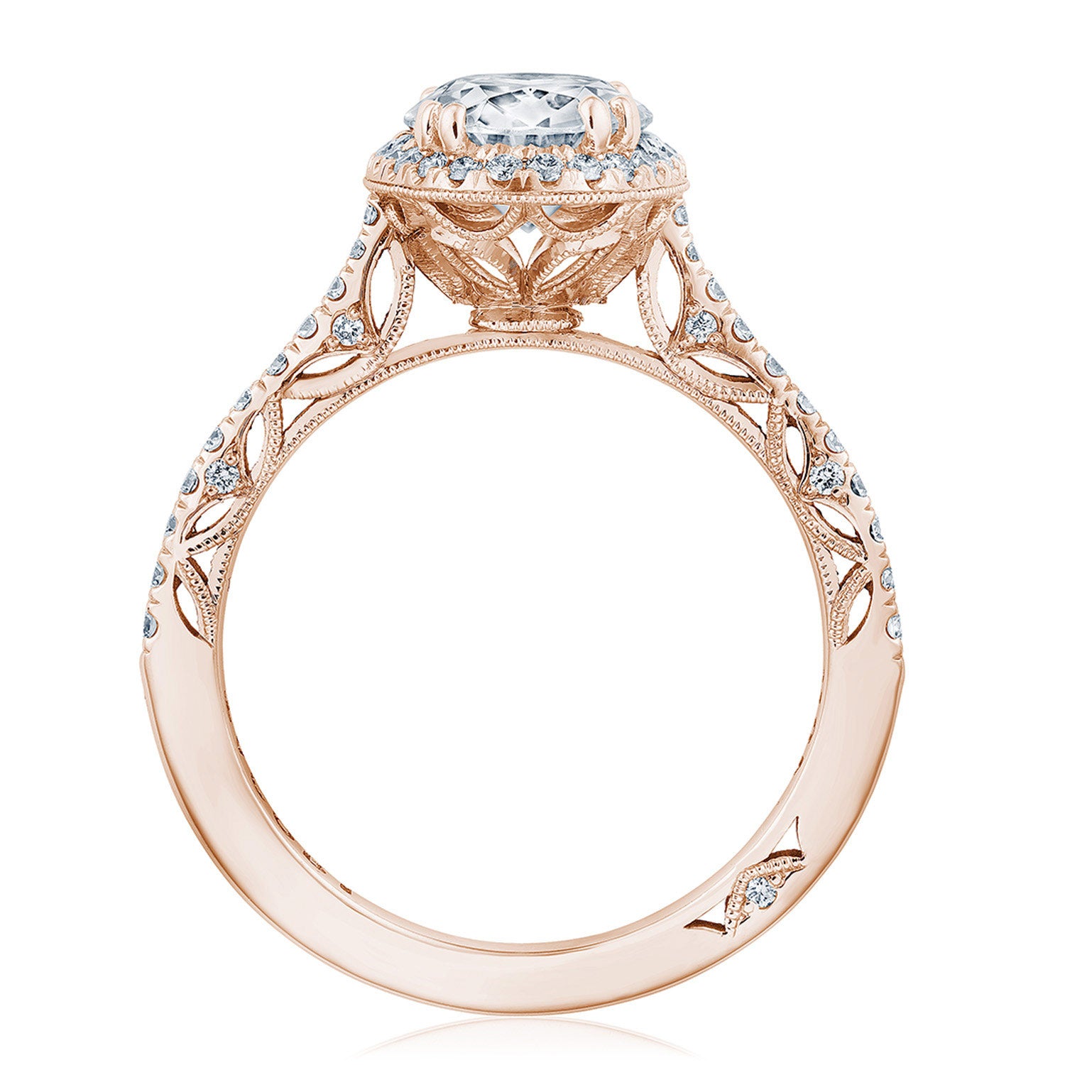 A subtle Spotlight Bloom encircles the center stone, and more brilliance is added by the meticulous French pavé that leads up the ceiling. A lace-like Crescent Fabric, edged with milgrain, gives stunning texture to the inner face profile.