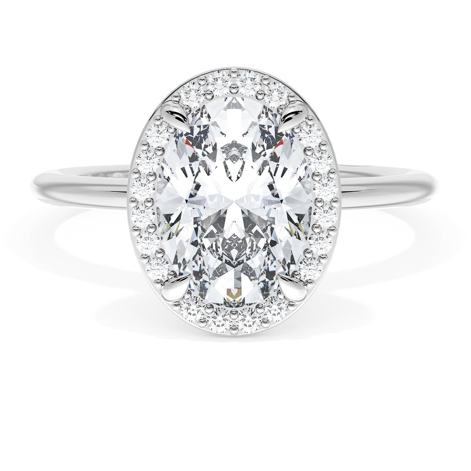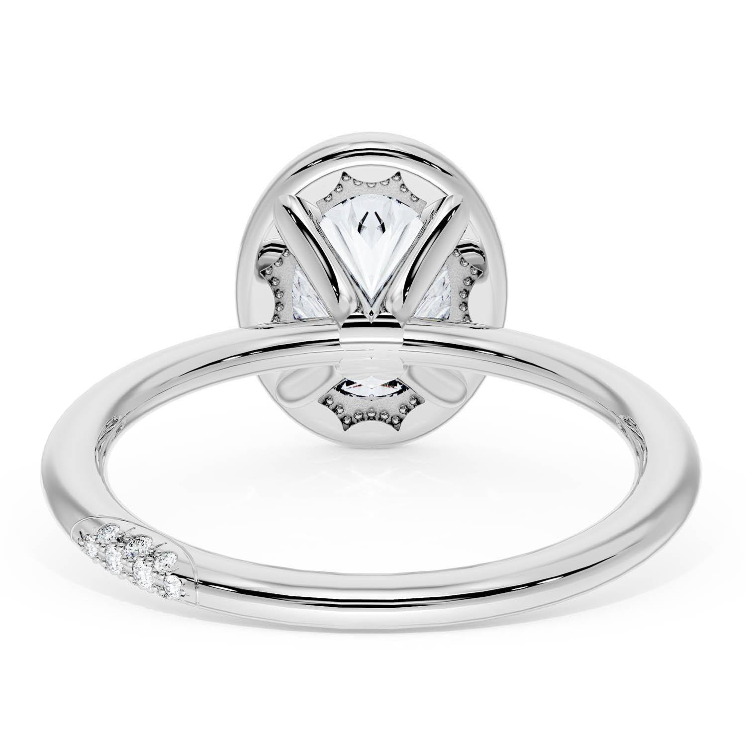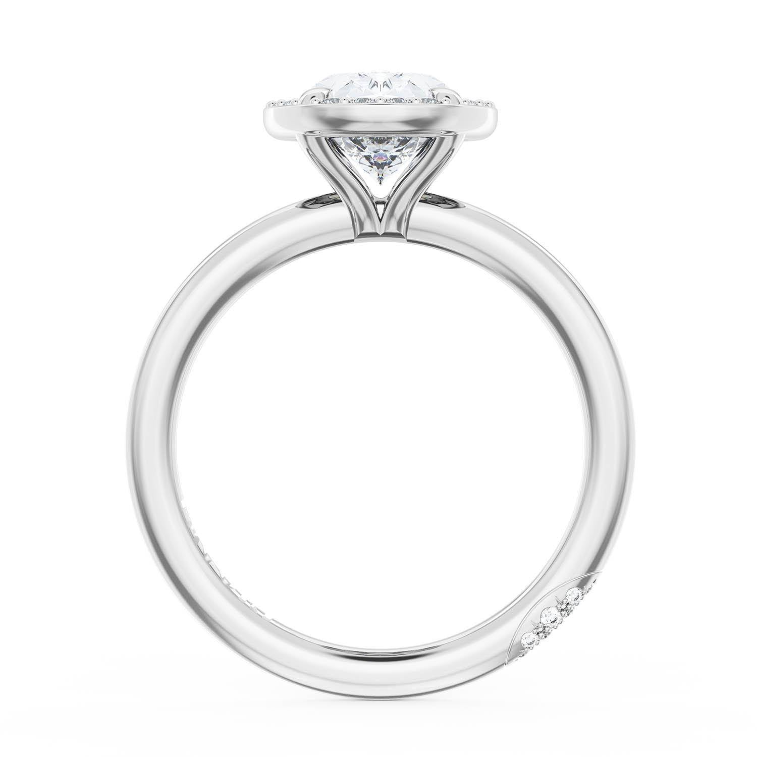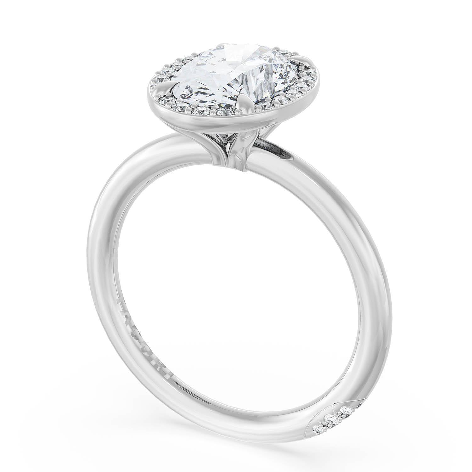 An Oval solitaire is elevated by a modern bloom of round brilliant diamonds, and set into a high-polish 18kt White Gold foundation. TACORI Crescents add hidden detail to the underside of the crown.