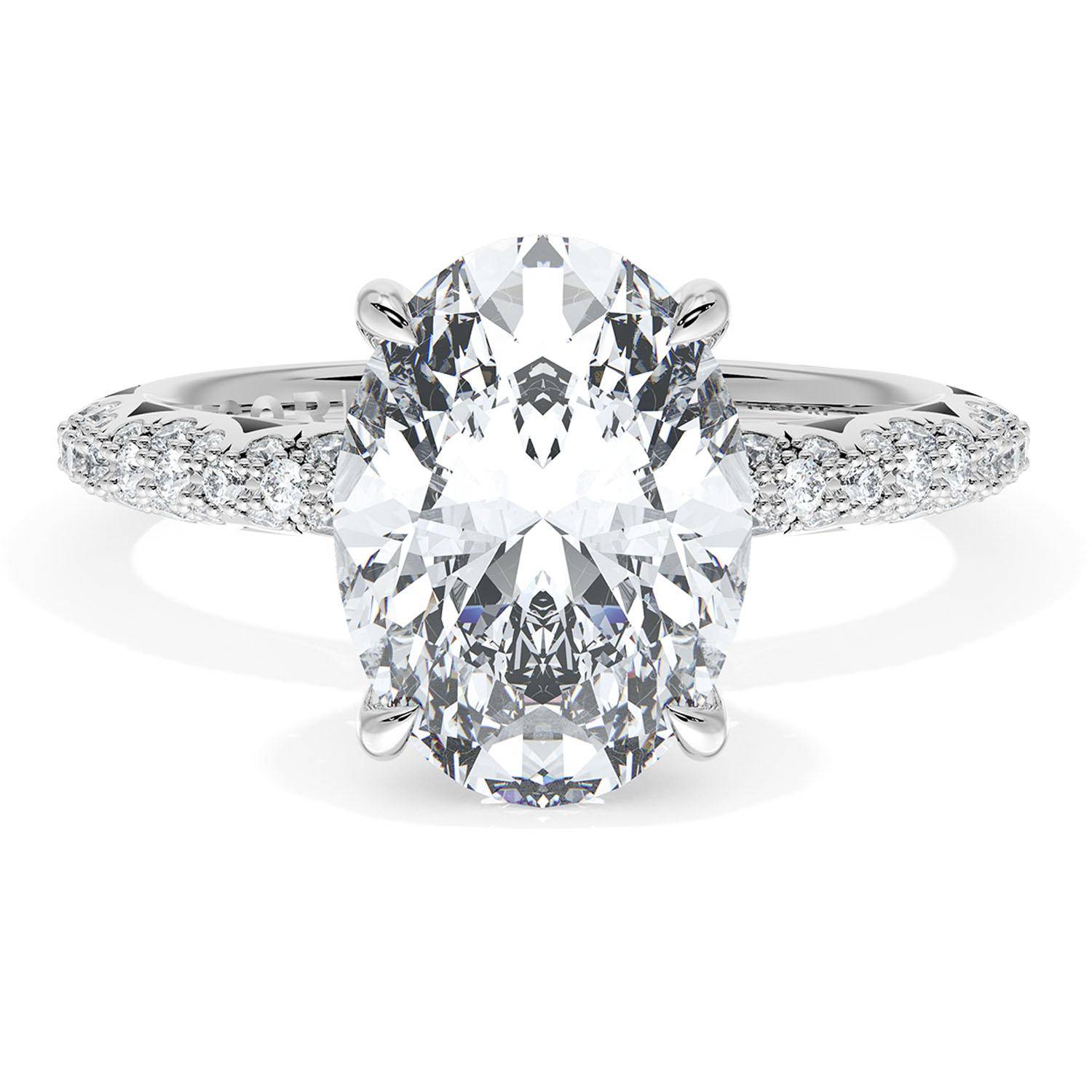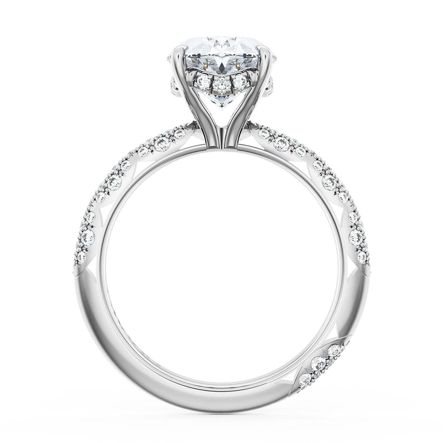 A 360 foundation is accented with a hidden bloom of diamonds, while the Founder's Crescent Fabric wraps around the ceiling of the ring. The ring is finished with a diamond-studded Signature Crescent.