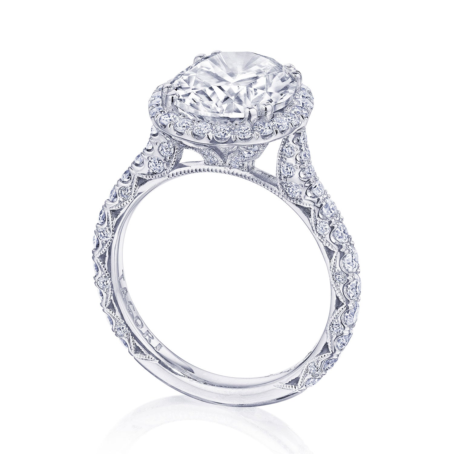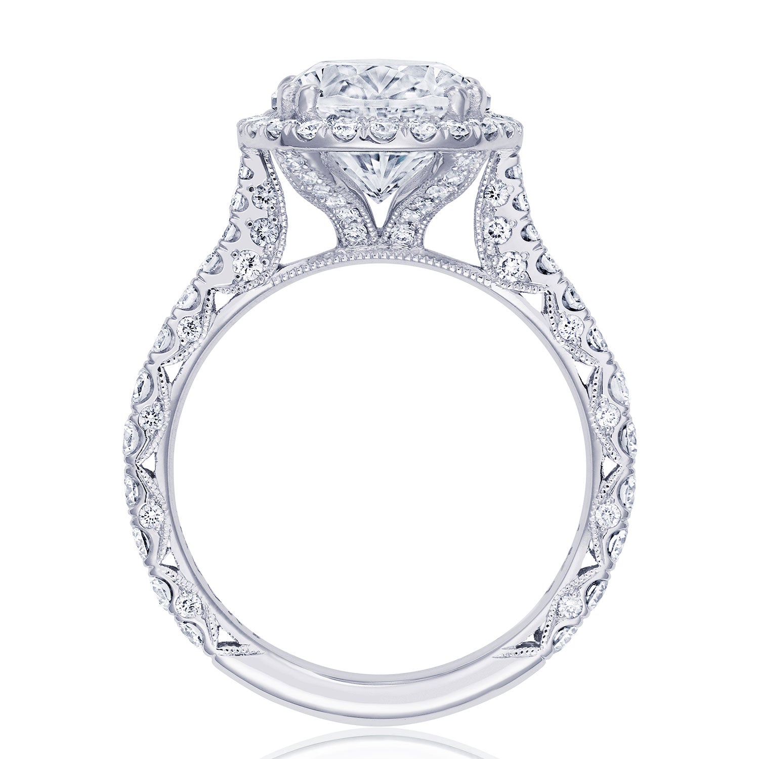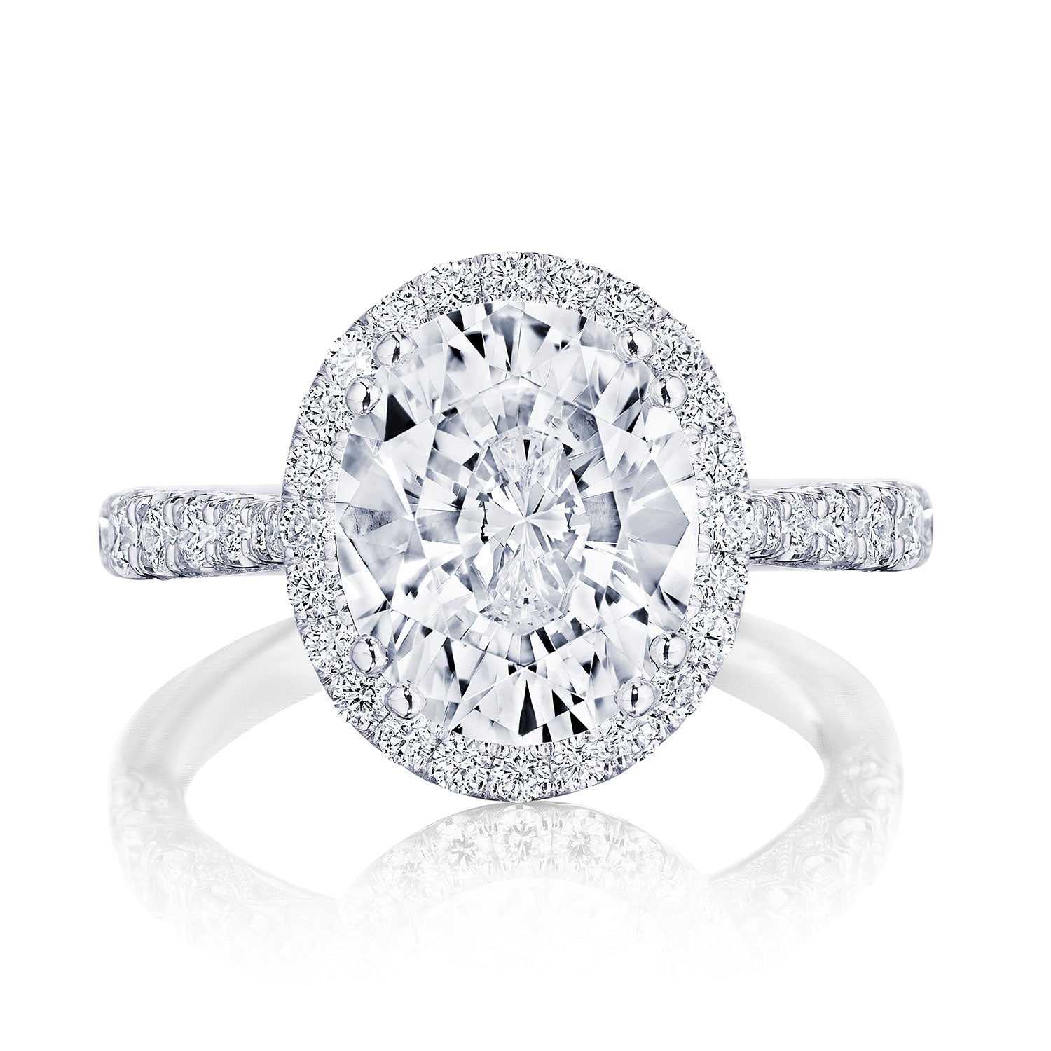 Make it bloom! A new diamond-intense bloom version of style HT2663 that's sure to be the envy of all. Graduating diamonds along the band lead up to a beautiful diamond bloom that spotlights and brings your center diamond to life.