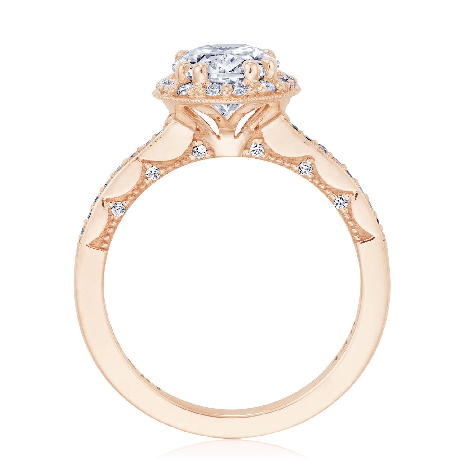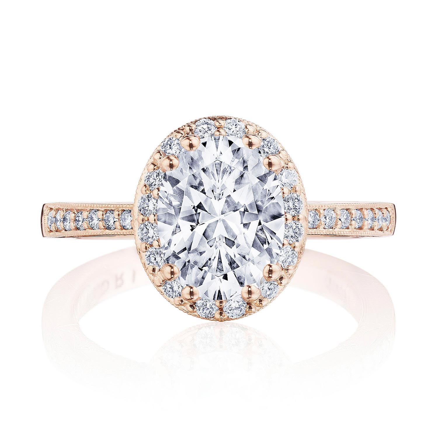 An oval cut diamond solitaire is brought to life by a bloom of diamonds and rests gently on a diamond band. This ring features the Coastal Crescent inner face with pinpoint diamond details for a truly regal look.