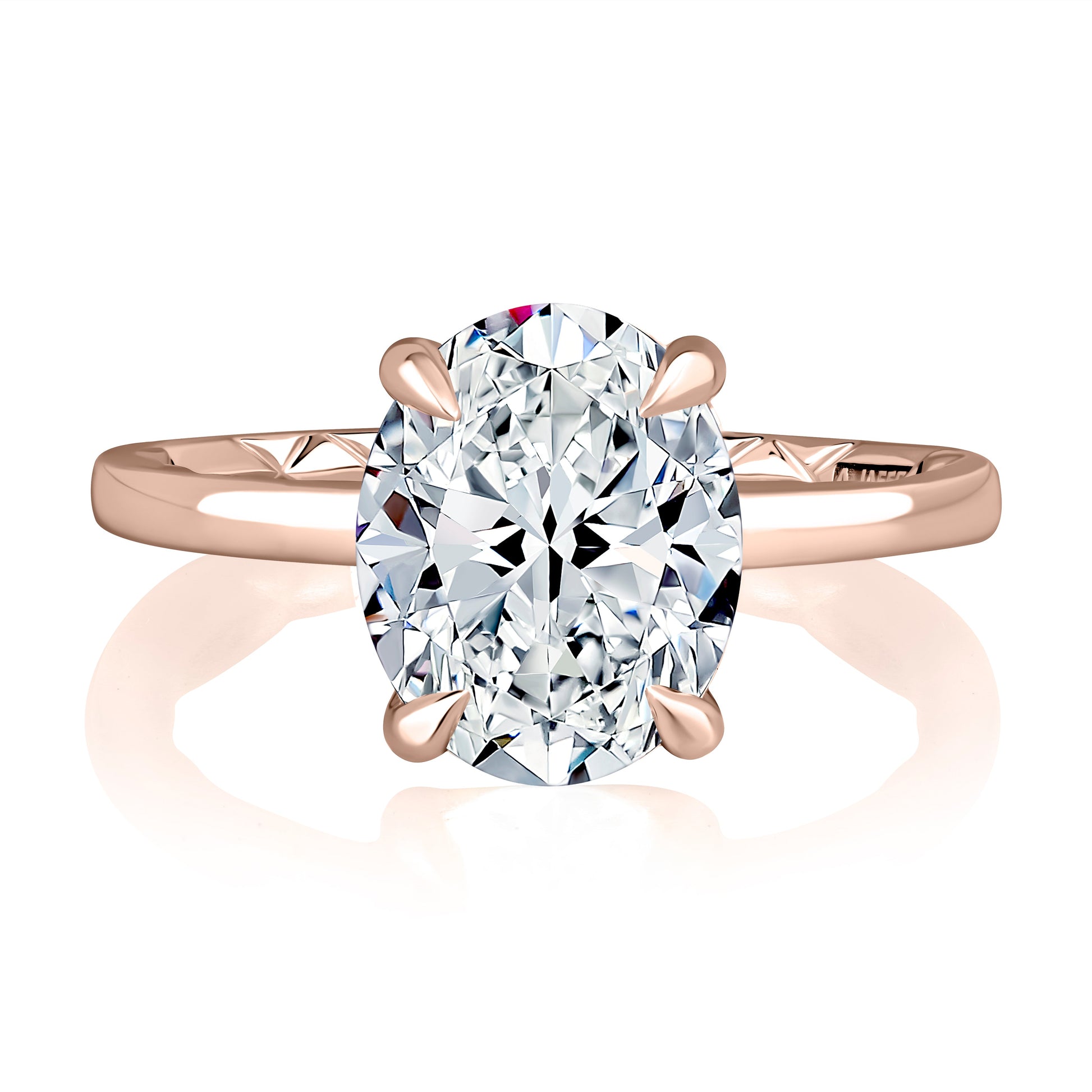 This oval center diamond solitaire engagement ring features a striking oval diamond, complemented by a hidden halo that amplifies its brilliance. The Quilts® interior offers a secure, smooth fit, making this ring a perfect blend of timeless design and modern craftsmanship. A symbol of everlasting love and commitment.