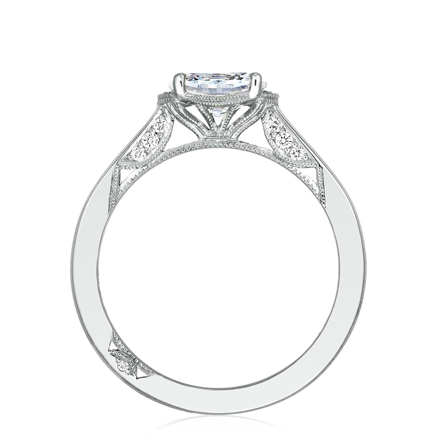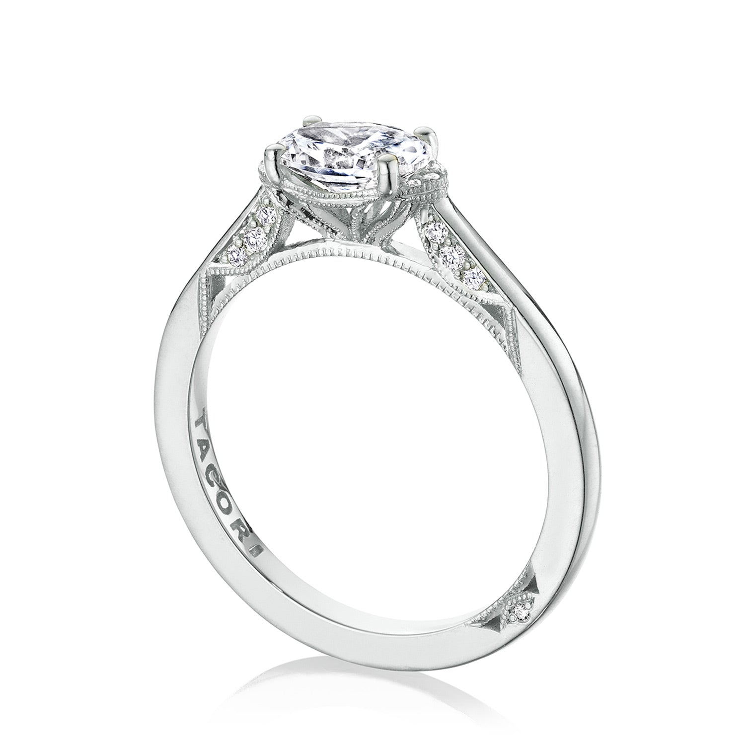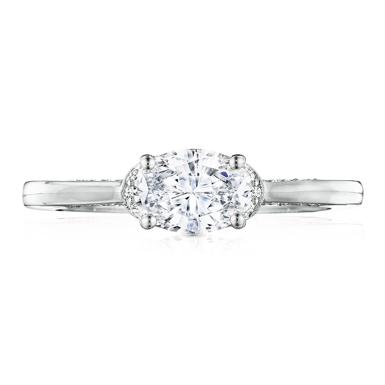 Broaden your horizons! Modern and unexpected, your oval center is flipped in a horizontal orientation along the axis of your Tacori ring. Accentuated by a diamond tipped frame that spotlights the elongated elegance of your oval center, this new Tacori style can be worn as a contemporary engagement ring or worn as a fashionable stacking right hand ring.
