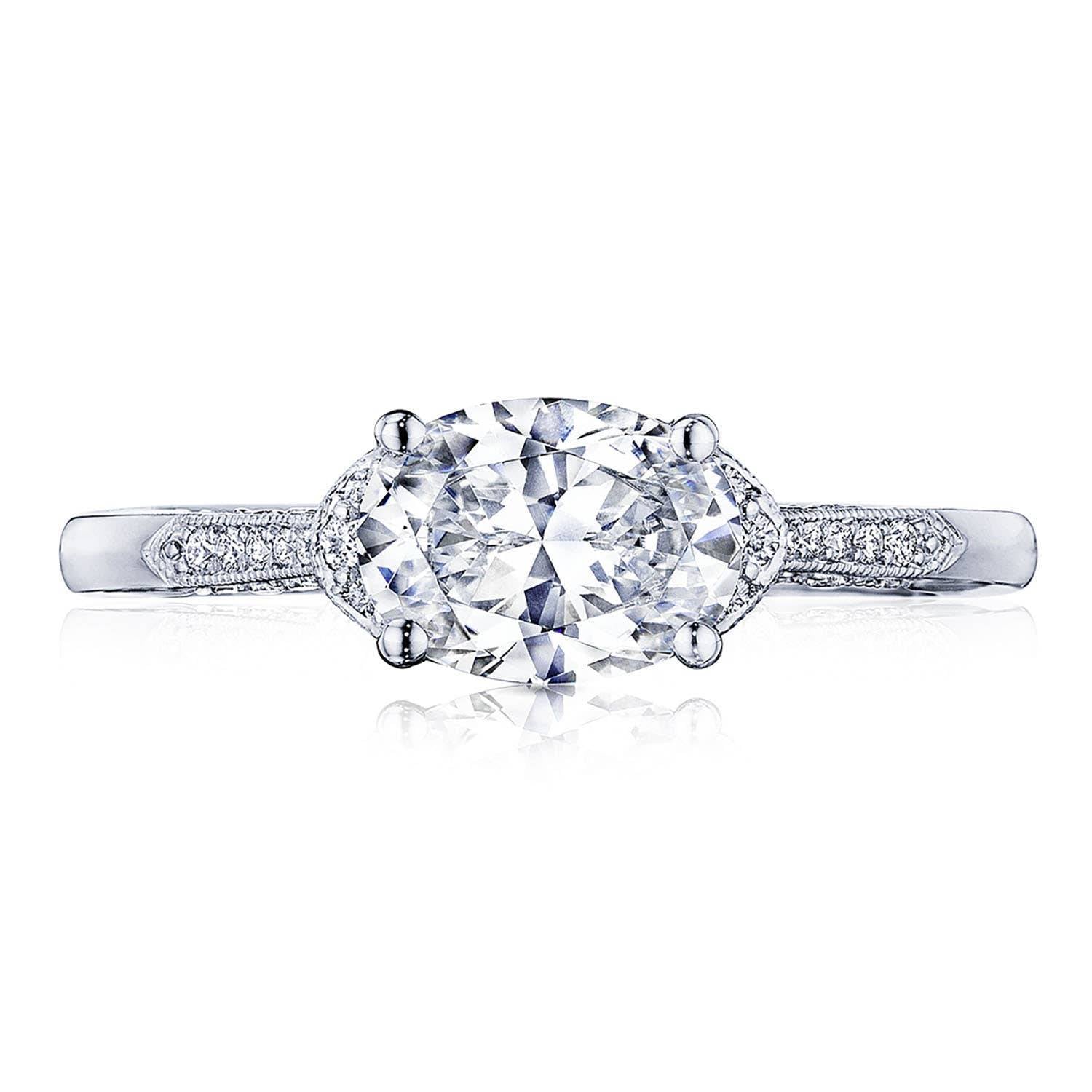 Directionally chic and delightfully unexpected, your oval center takes on an east west orientation, accentuated by a diamond tipped frame to bring your center to life. Set along a high polished band with pavé set diamonds with crescent silhouette details, this ring will never cease to delight and surprise you.