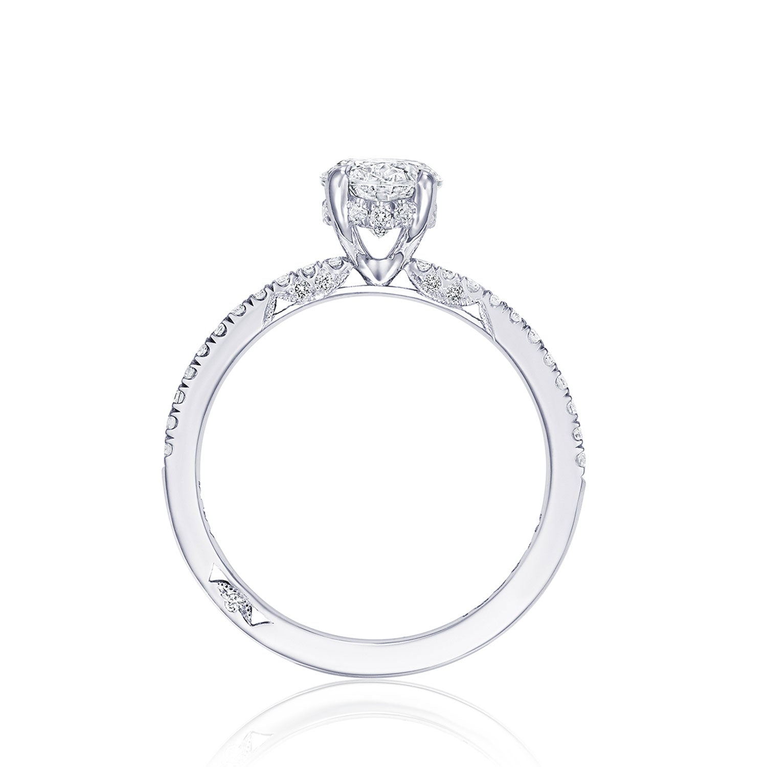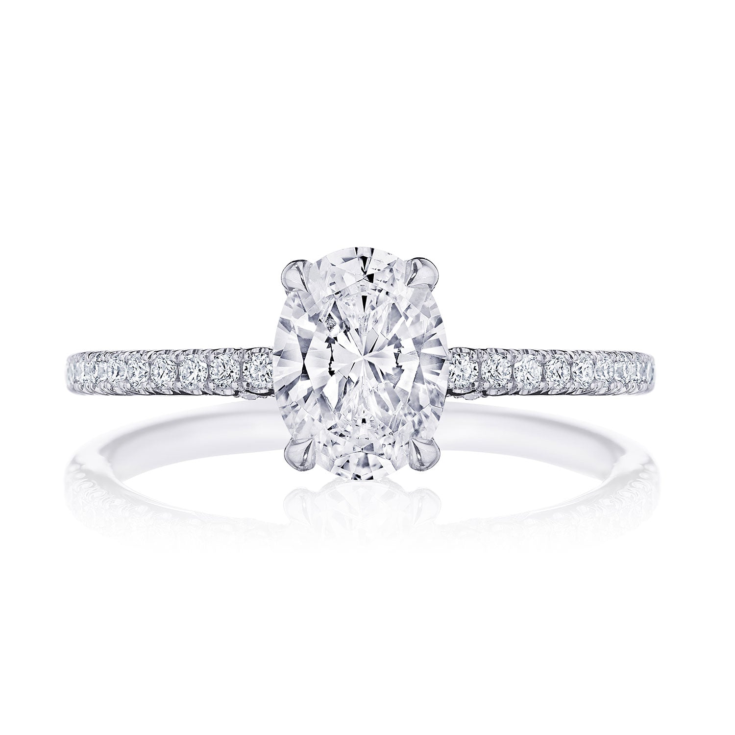 Strong solitaire look with a thin band that delivers brilliant detail- this Truly T varietal of Simply Tacori features a 360 foundation with French pavé set diamonds on the band and is perfect for the modern bride. Look for the secret diamond inscribed, “T” detail on the setting of the ring.