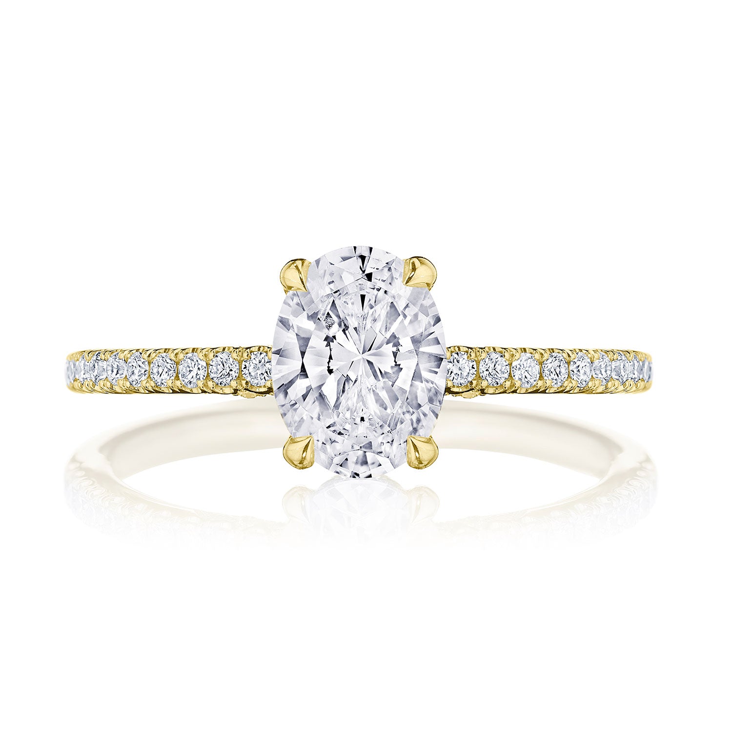 Strong solitaire look with a thin band that delivers brilliant detail- this Truly T varietal of Simply Tacori features a 360 foundation with French pavé set diamonds on the band and is perfect for the modern bride. Look for the secret diamond inscribed, “T” detail on the setting of the ring.