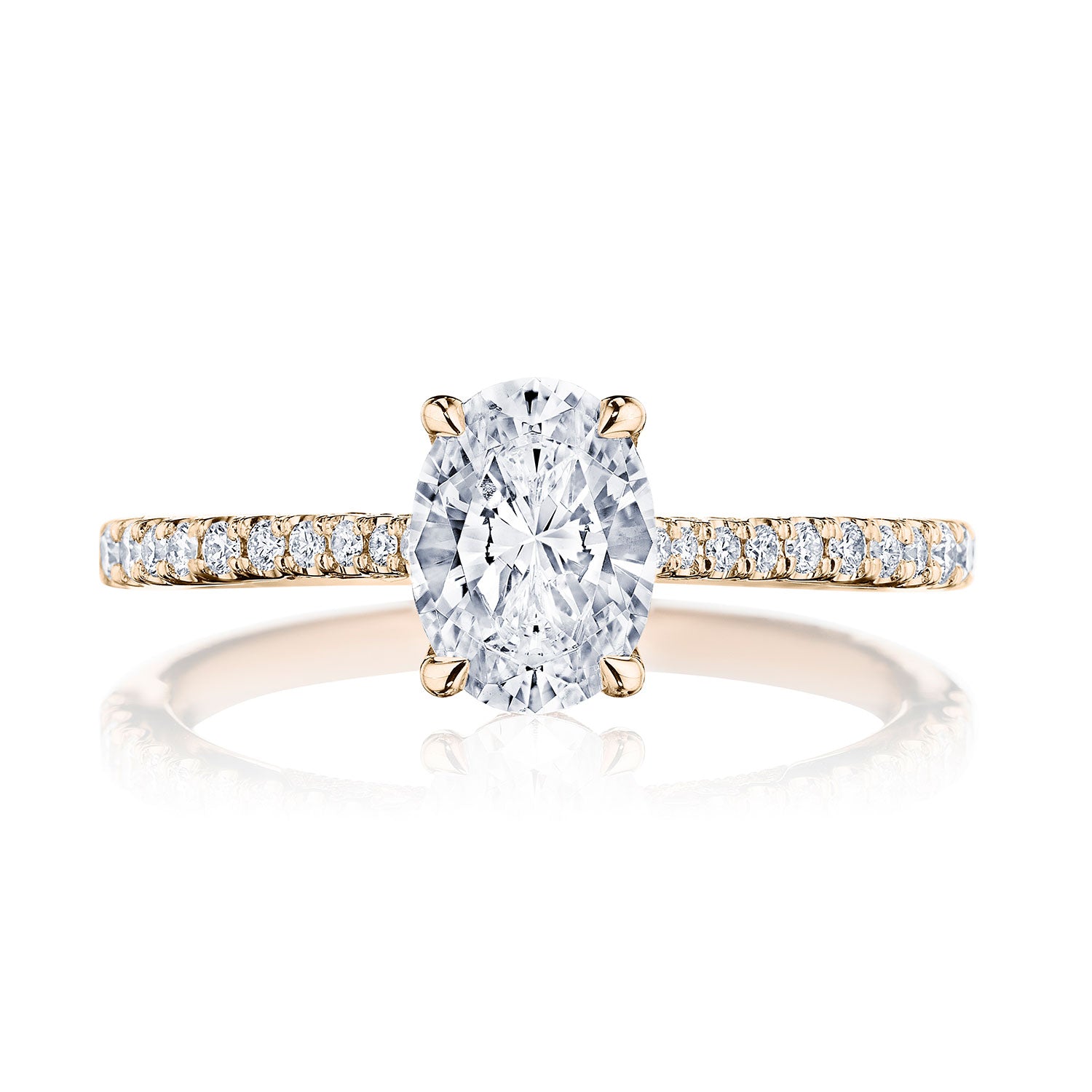 Strong solitaire look with a thin band that delivers brilliant detail- this Truly T varietal of Simply Tacori features a Cathedral foundation with French pavé set diamonds on the band and is perfect for the modern bride. Look for the secret diamond inscribed, “T” detail on the setting of the ring.